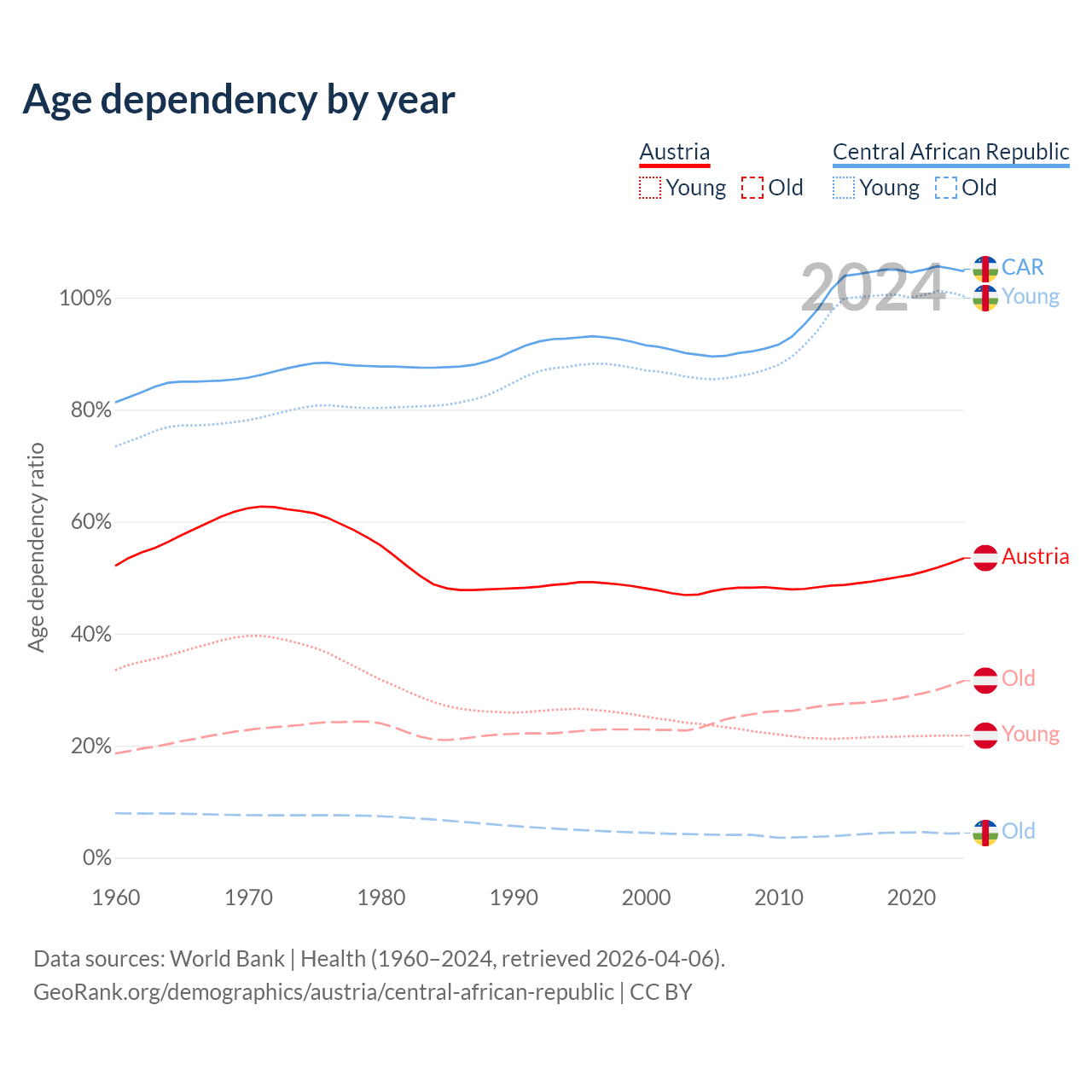 Data sources: World Bank | Health (1960–2024, retrieved 2026-04-06); U.S. Census Bureau (1960–2024, retrieved 2026-02-08).