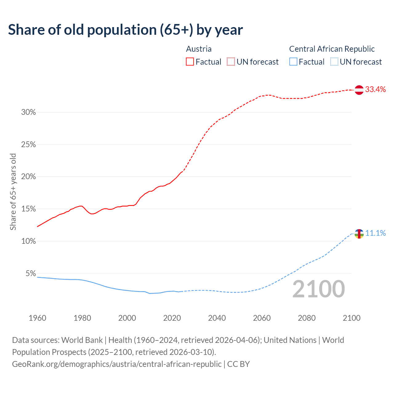 The share of older people aged 65 and over is 20.6% in Austria and 2.15% in the Central African Republic. Life expectancy in Austria compared to the Central African Republic .