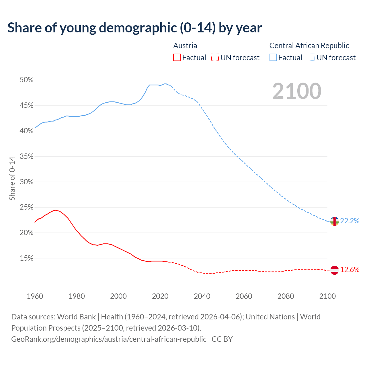 - The share of young demographic (0-15 years old) in Austria is 14.2% vs 49% in the Central African Republic.