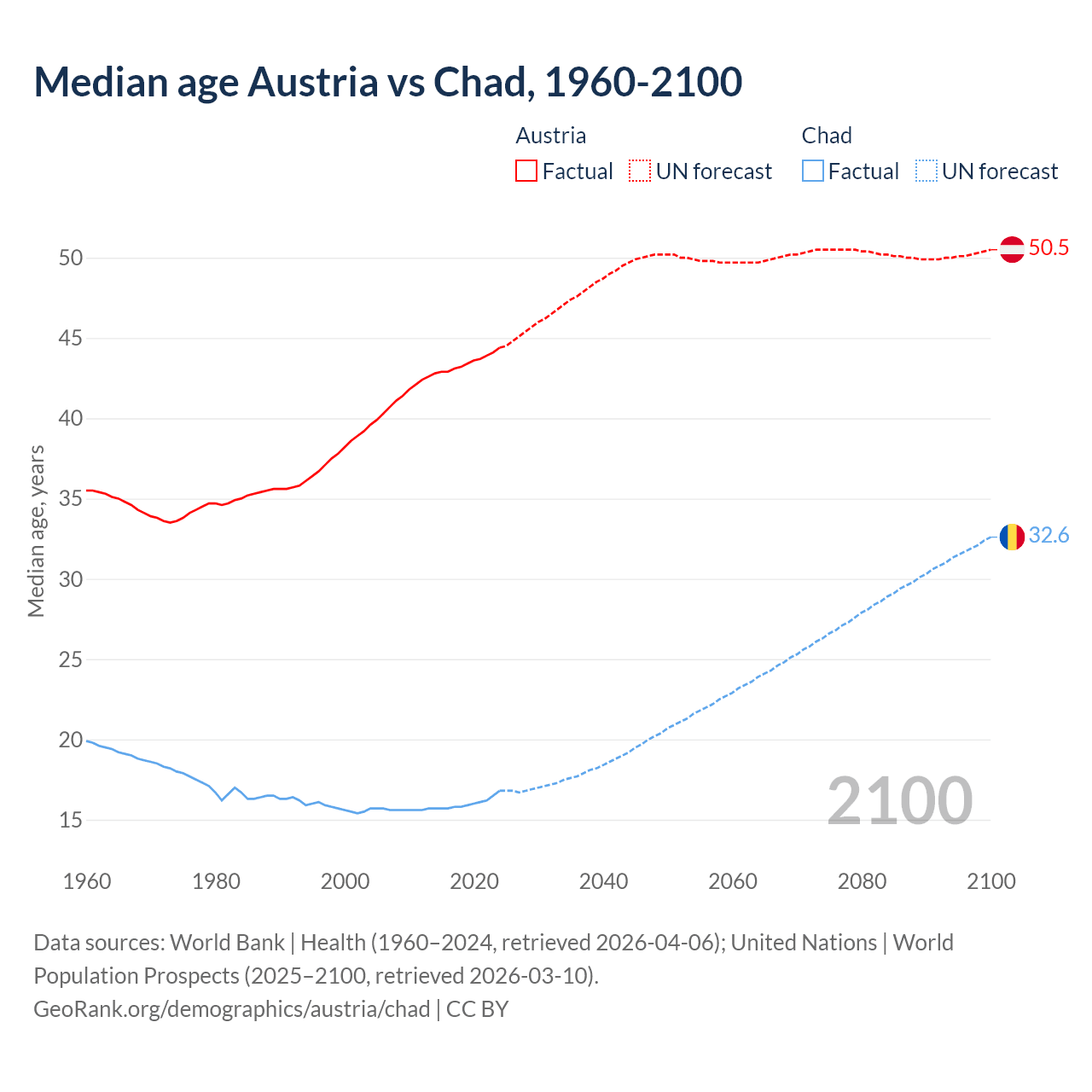 Median age Austria vs Chad, 1960-2100