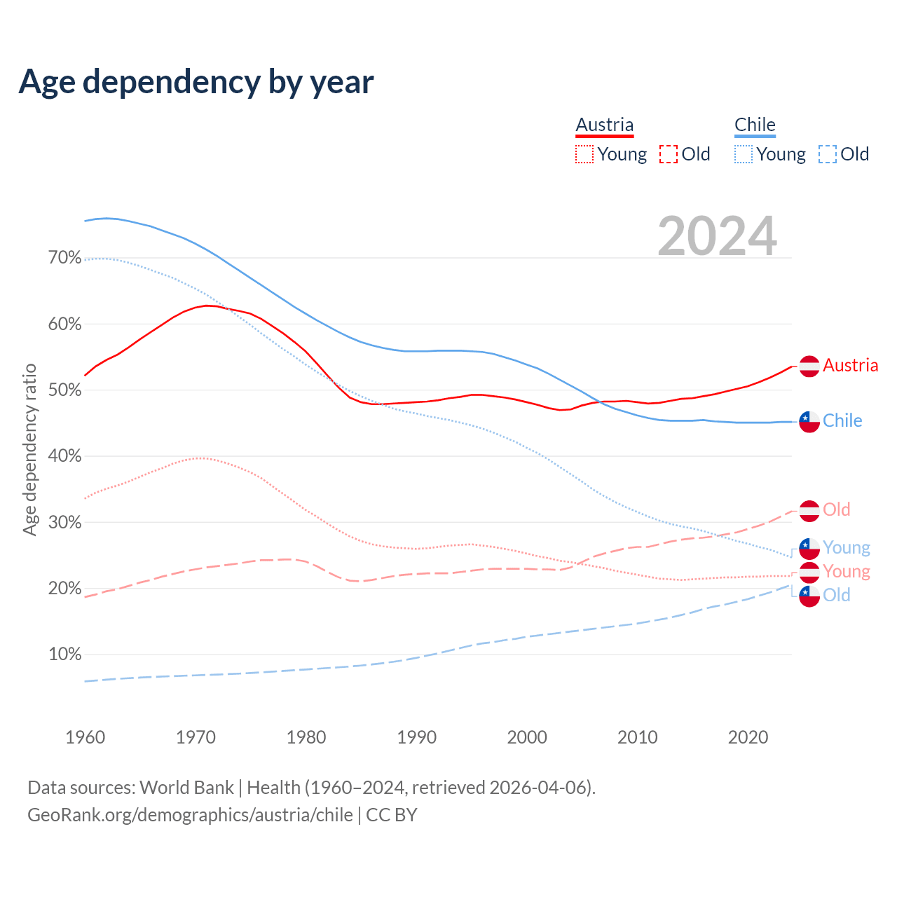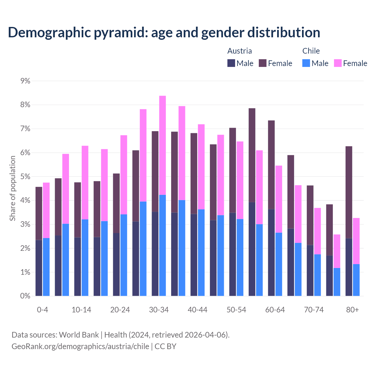 - Austria is ranked 19/196 by median age (oldest to youngest) vs 61/196 for Chile.