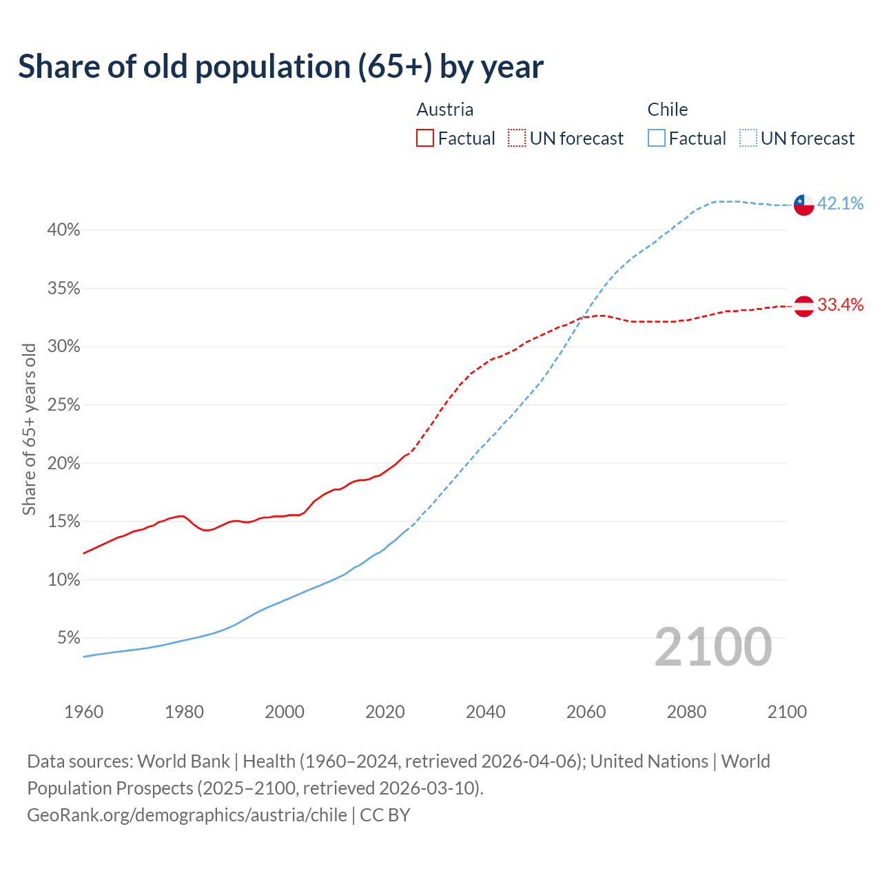 - The share of old-age demographic (65+) in Austria is 20.6% vs 14.1% in Chile.