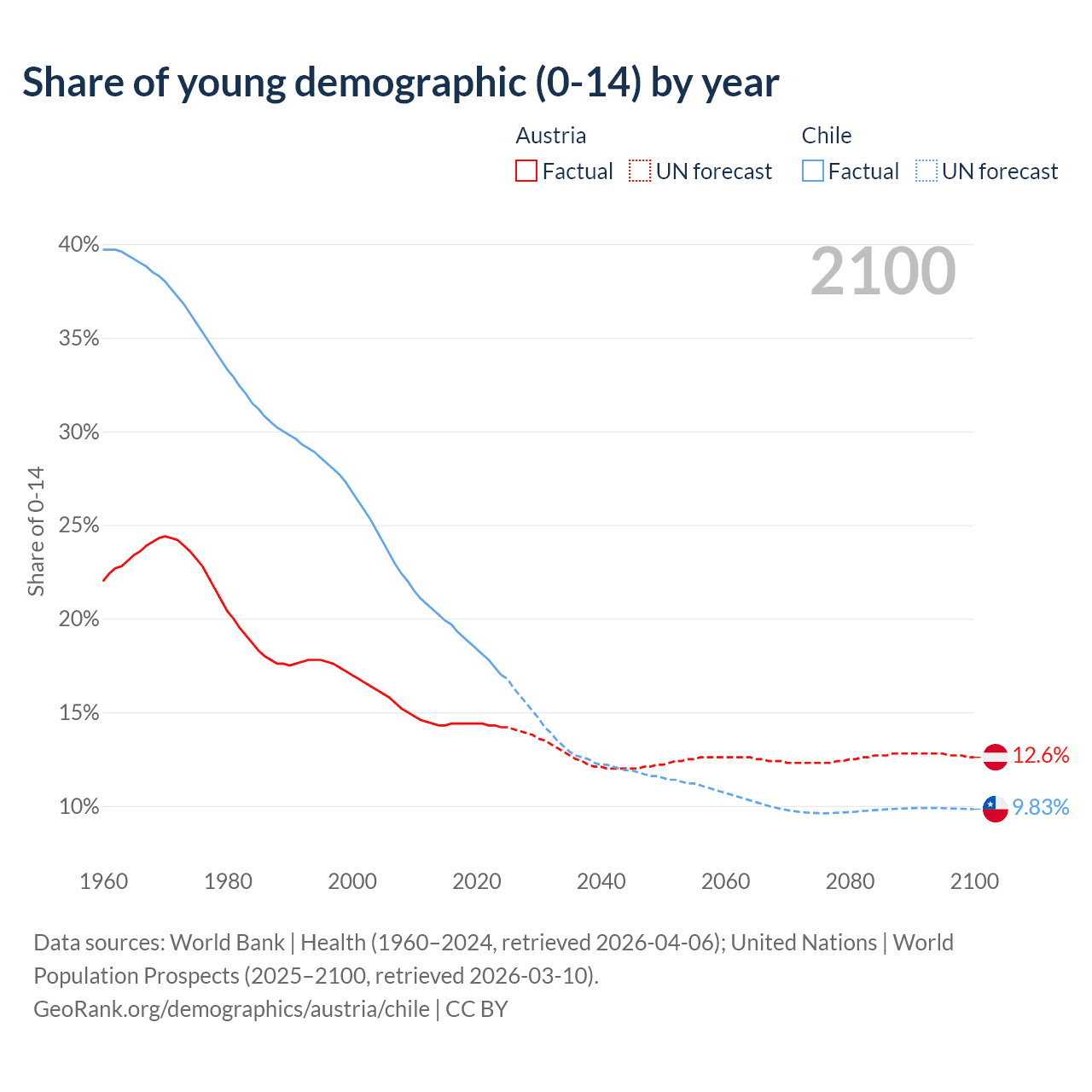 - The share of young demographic (0-15 years old) in Austria is 14.2% vs 17% in Chile.
