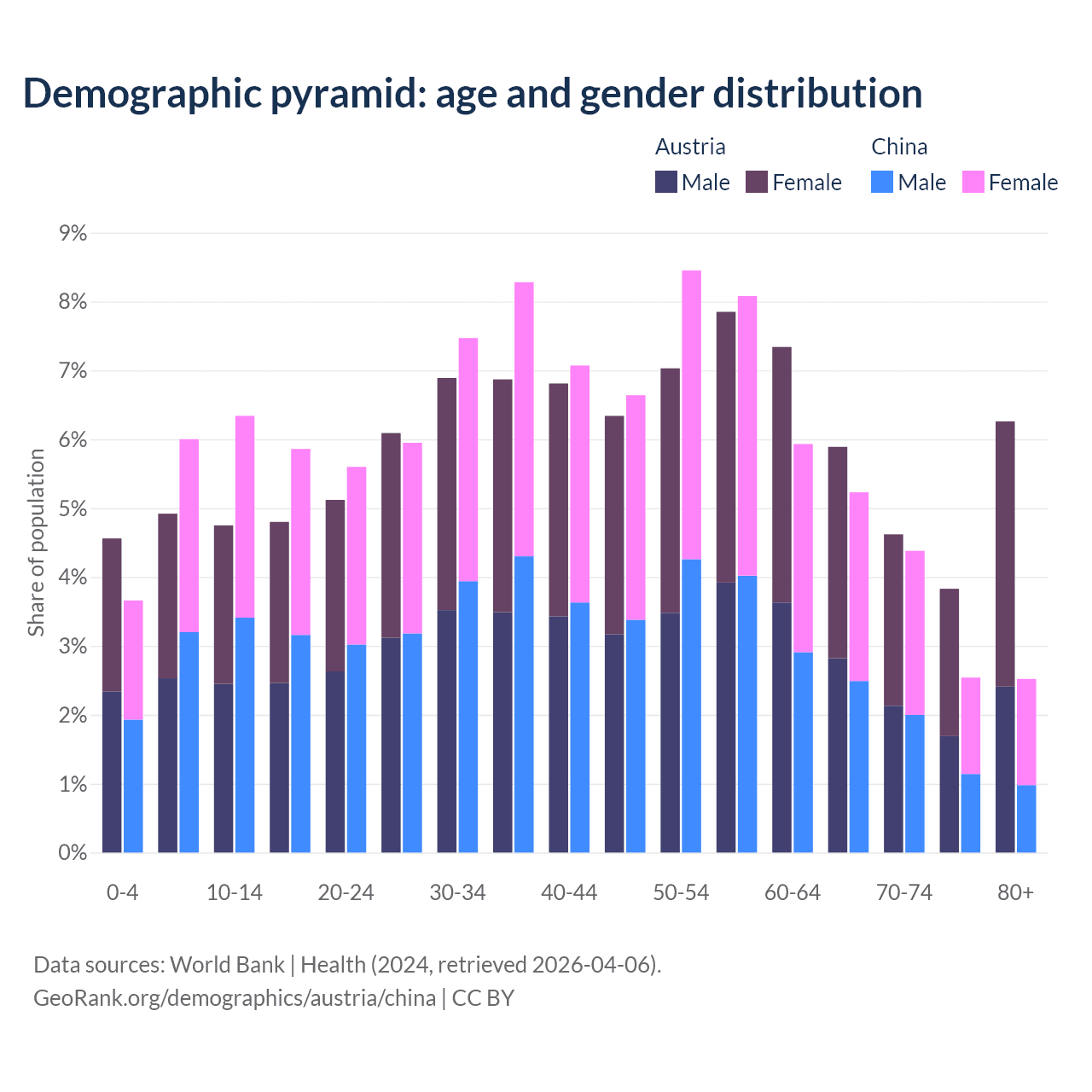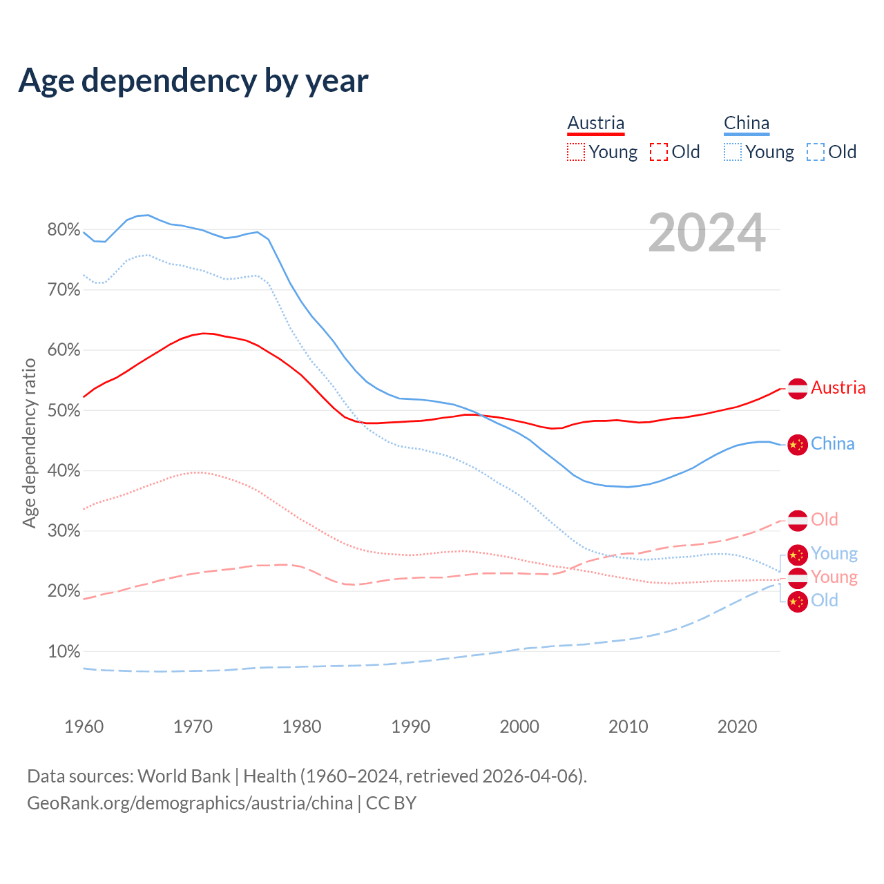 - Austria is ranked 19/196 by median age (oldest to youngest) vs 44/196 for China.