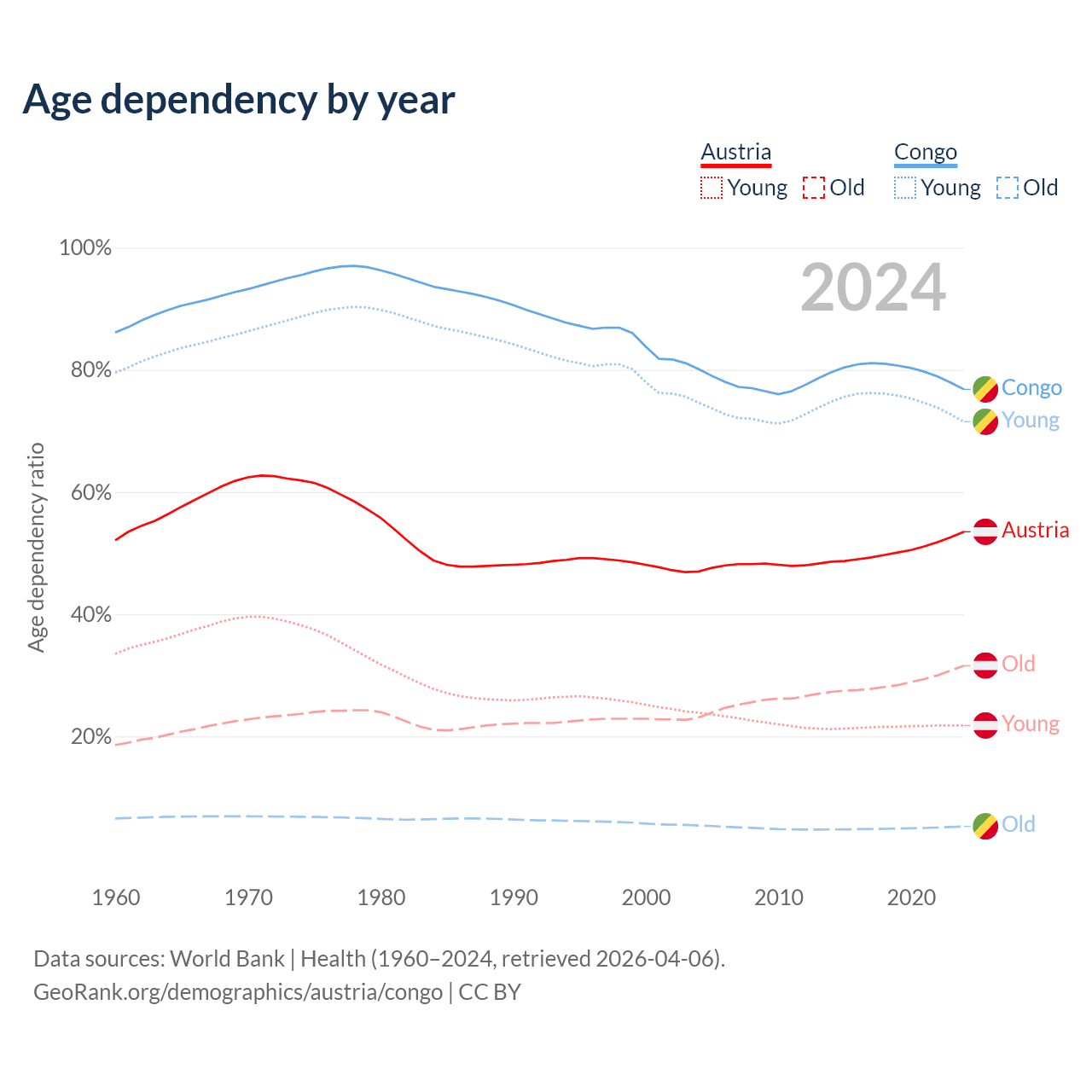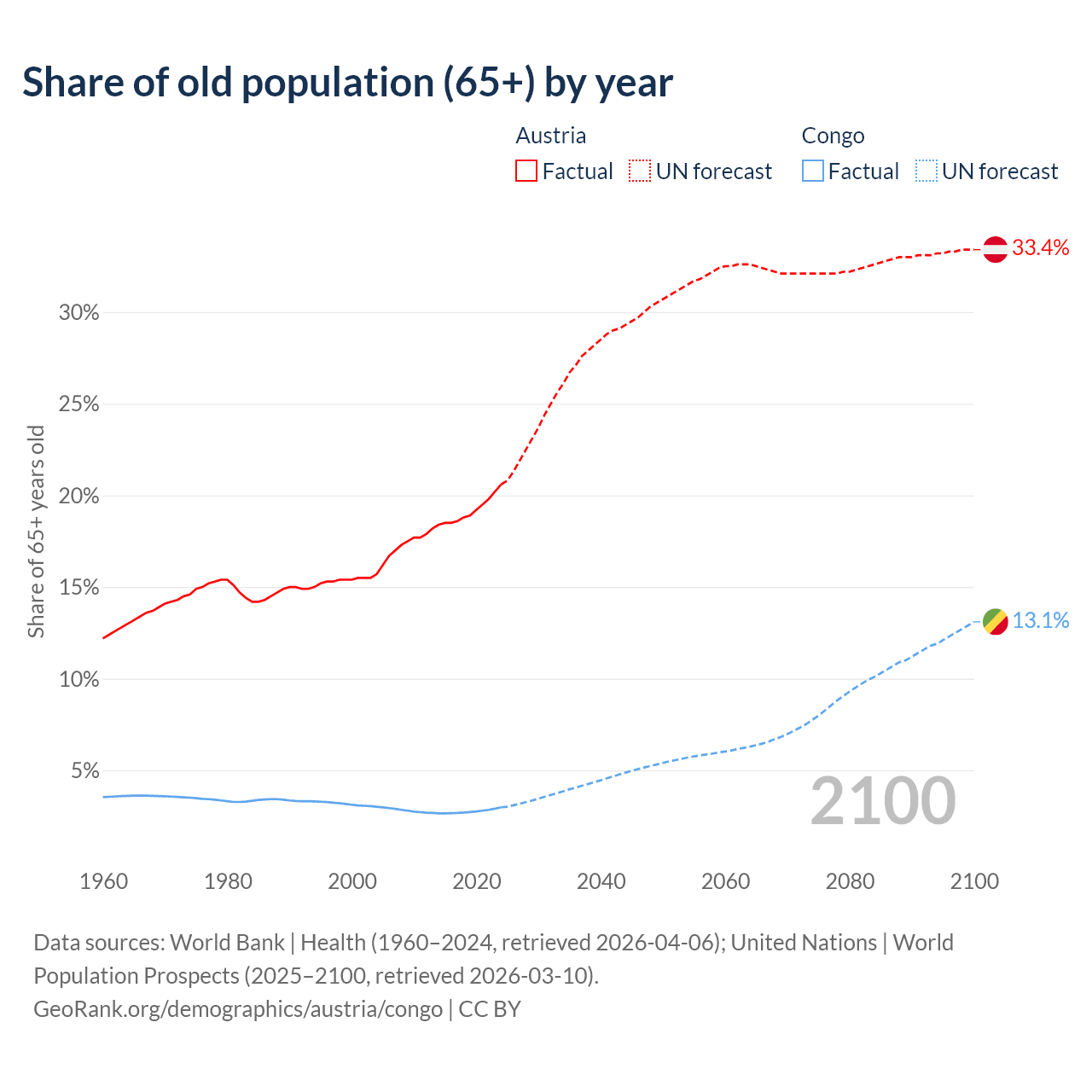 The share of older people aged 65 and over is 20.6% in Austria and 2.99% in the Congo. Life expectancy in Austria compared to the Congo .