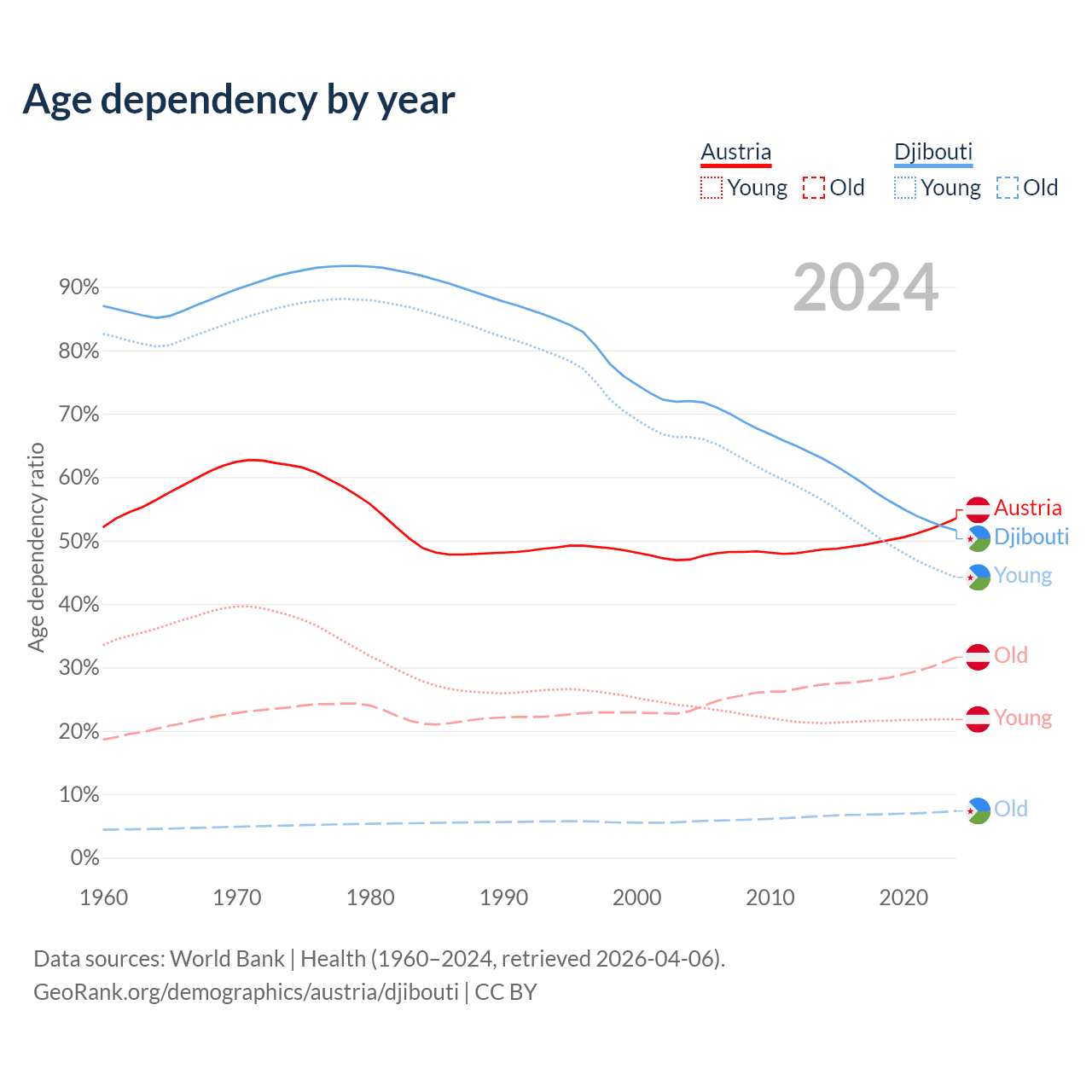 - Austria is ranked 19/196 by median age (oldest to youngest) vs 129/196 for Djibouti.