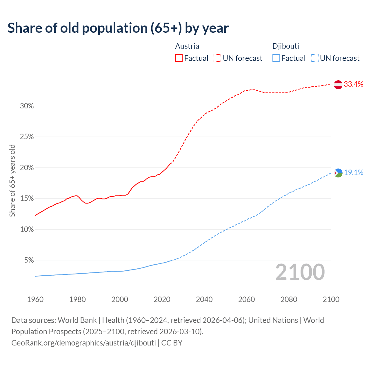 The share of older people aged 65 and over is 20.6% in Austria and 4.85% in Djibouti. Life expectancy in Austria compared to Djibouti .