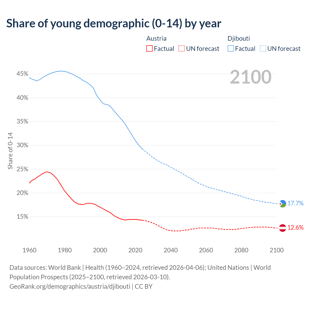 - The share of young demographic (0-15 years old) in Austria is 14.2% vs 29.2% in Djibouti.