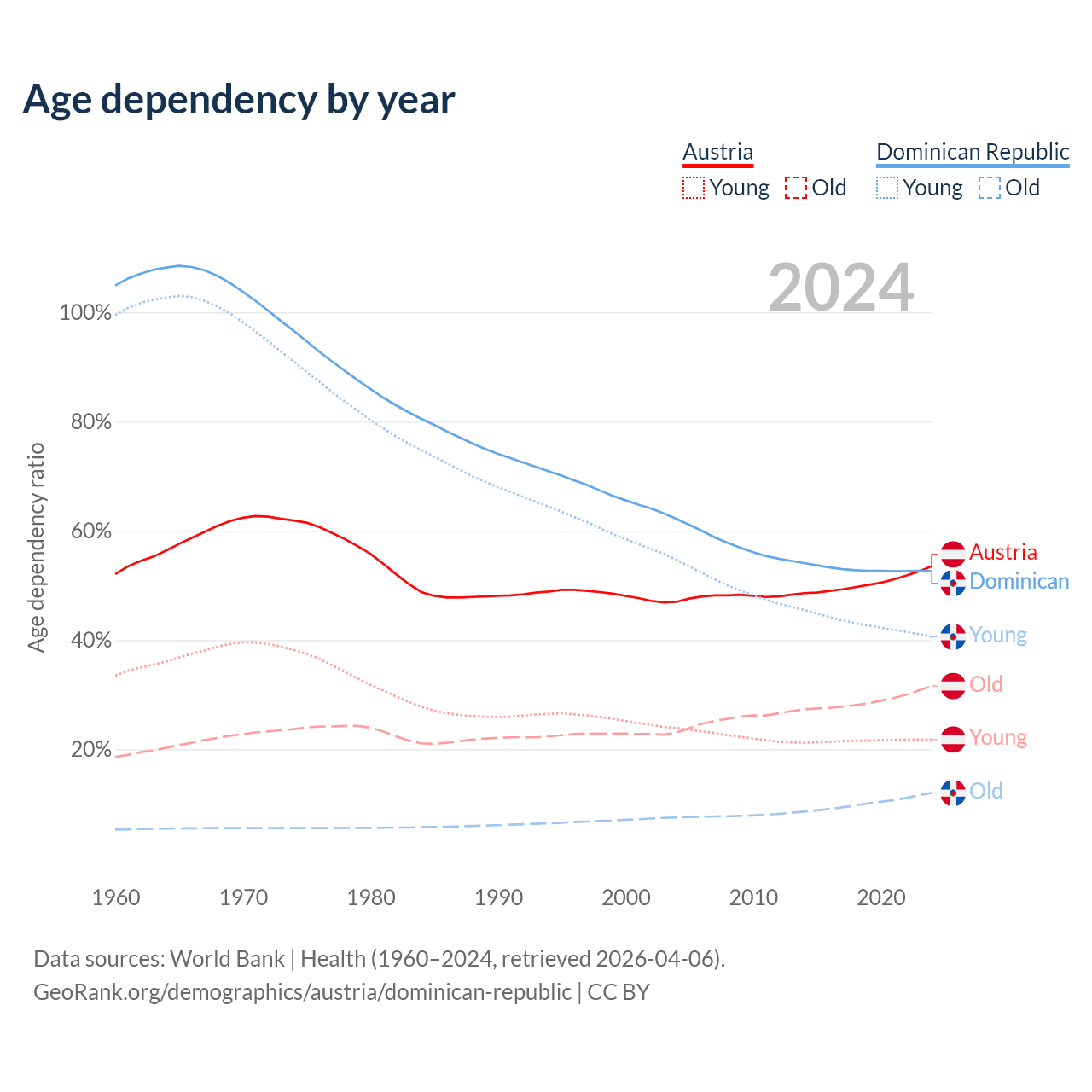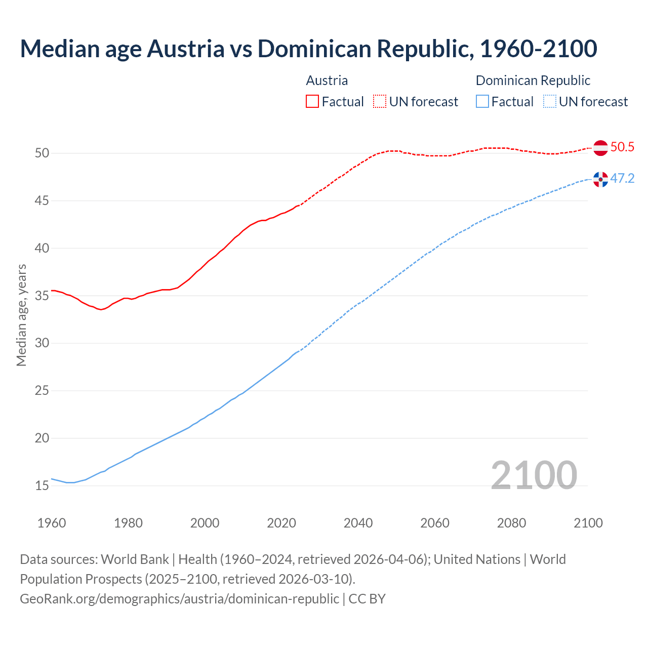 - Austria is ranked 19/196 by median age (oldest to youngest) vs 112/196 for the Dominican Republic.