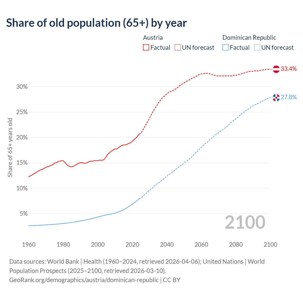 - The share of old-age demographic (65+) in Austria is 20.6% vs 7.88% in the Dominican Republic.