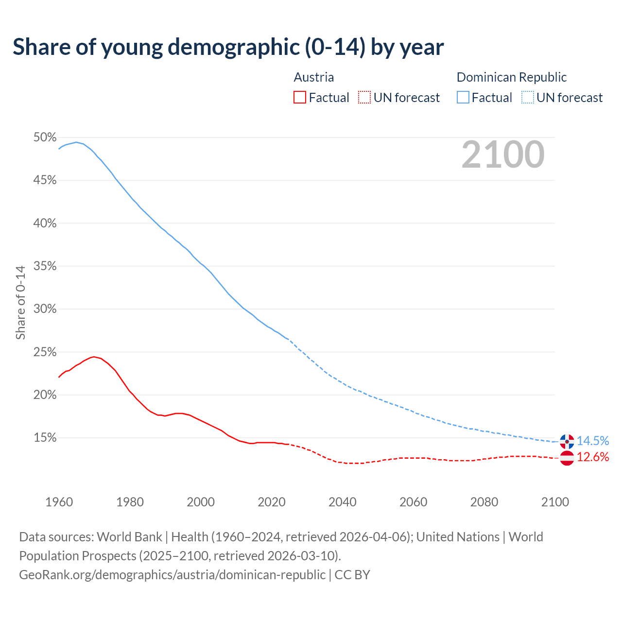 - The share of young demographic (0-15 years old) in Austria is 14.2% vs 26.6% in the Dominican Republic.