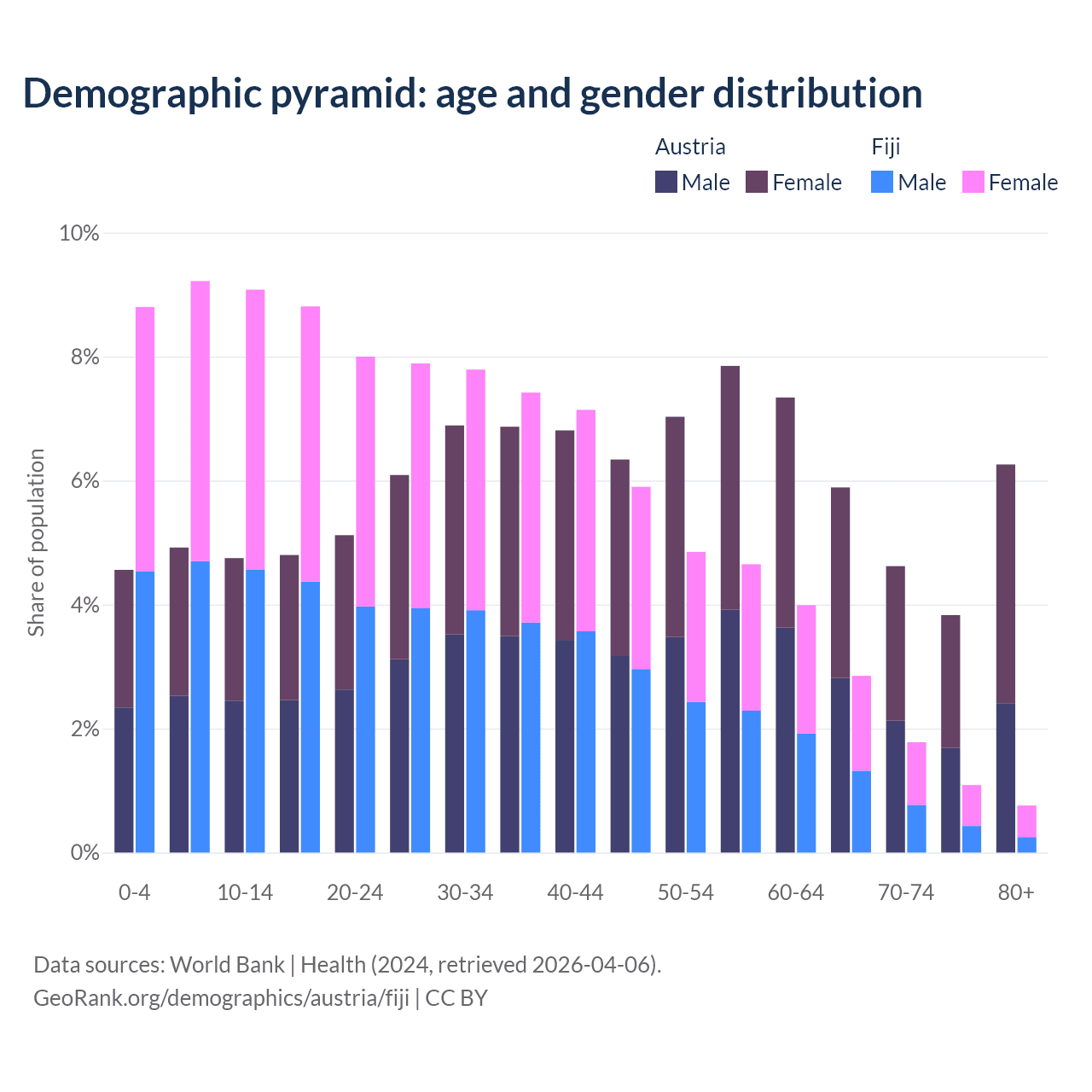- As of 2026, the population of Austria is 9.16M vs 939K in Fiji - 9.76 times difference.