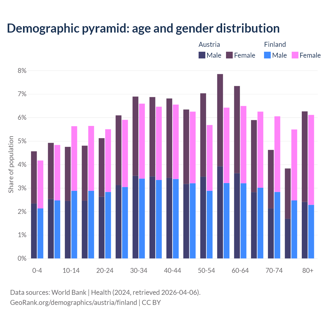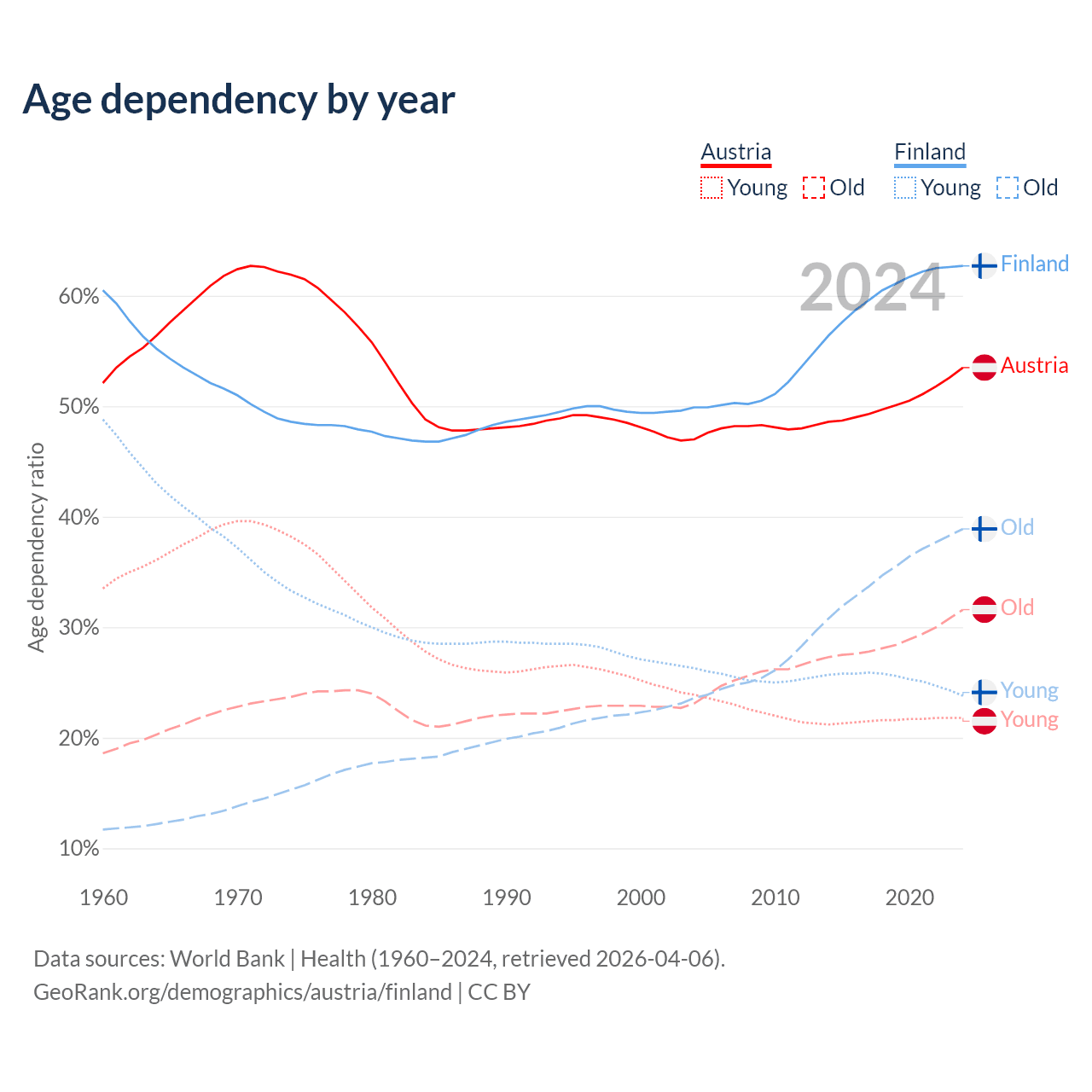 - Austria is ranked 19/196 by median age (oldest to youngest) vs 22/196 for Finland.