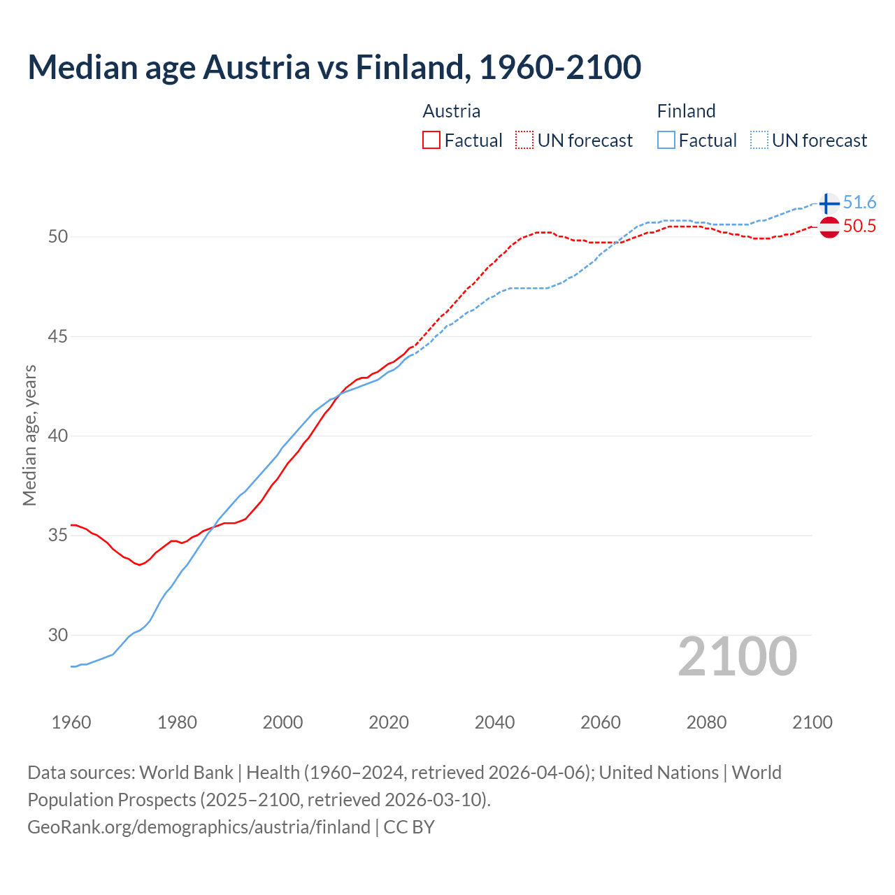 Median age Austria vs Finland, 1960-2100