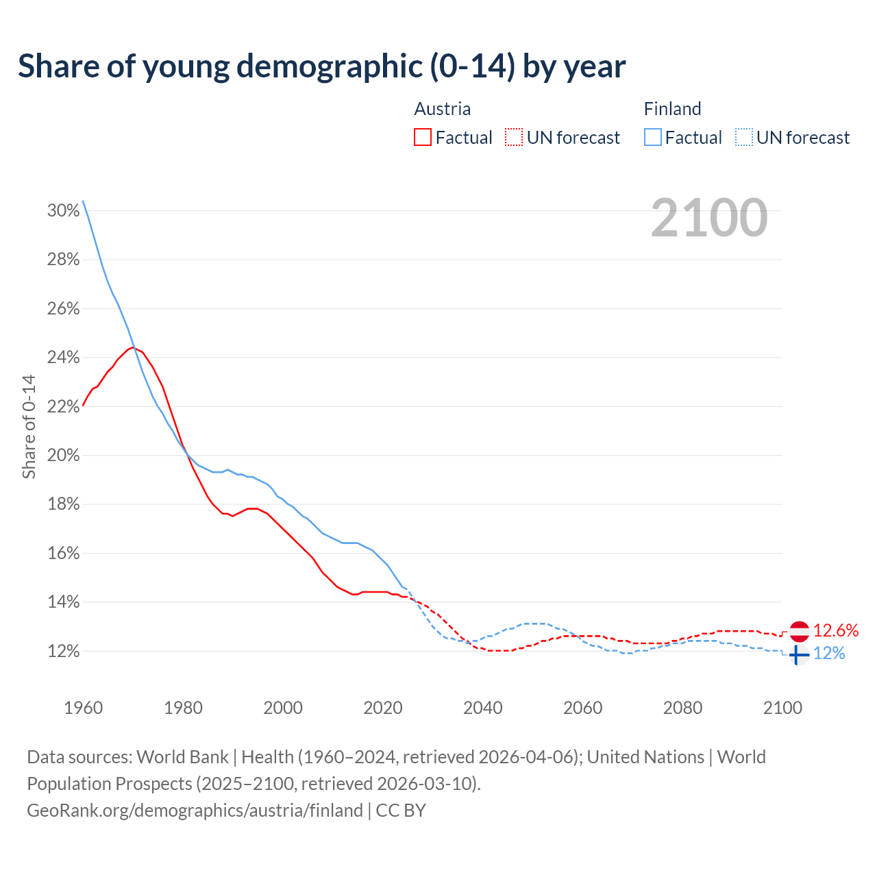 - The share of young demographic (0-15 years old) in Austria is 14.2% vs 14.6% in Finland.