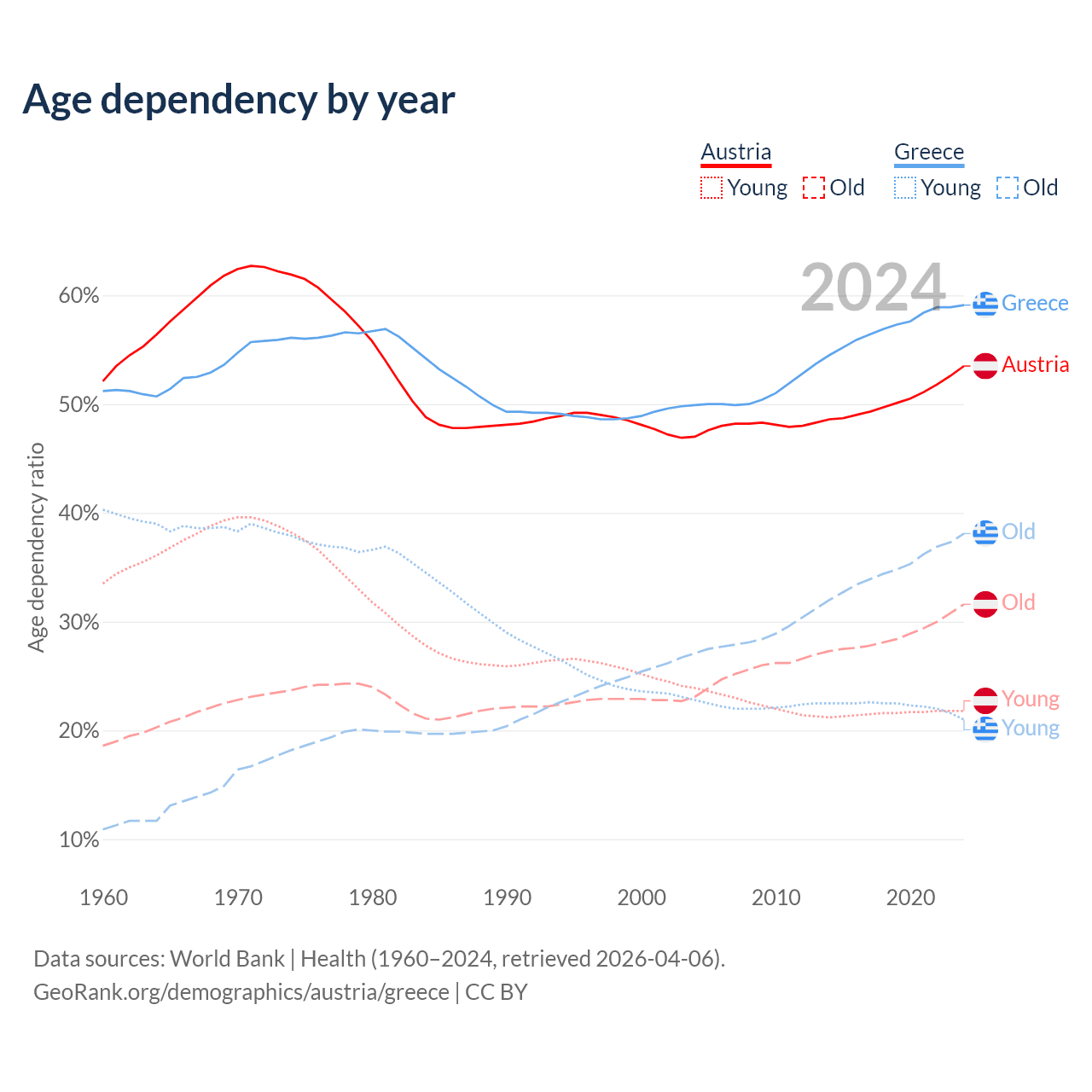 - Austria is ranked 19/196 by median age (oldest to youngest) vs 6/196 for Greece.