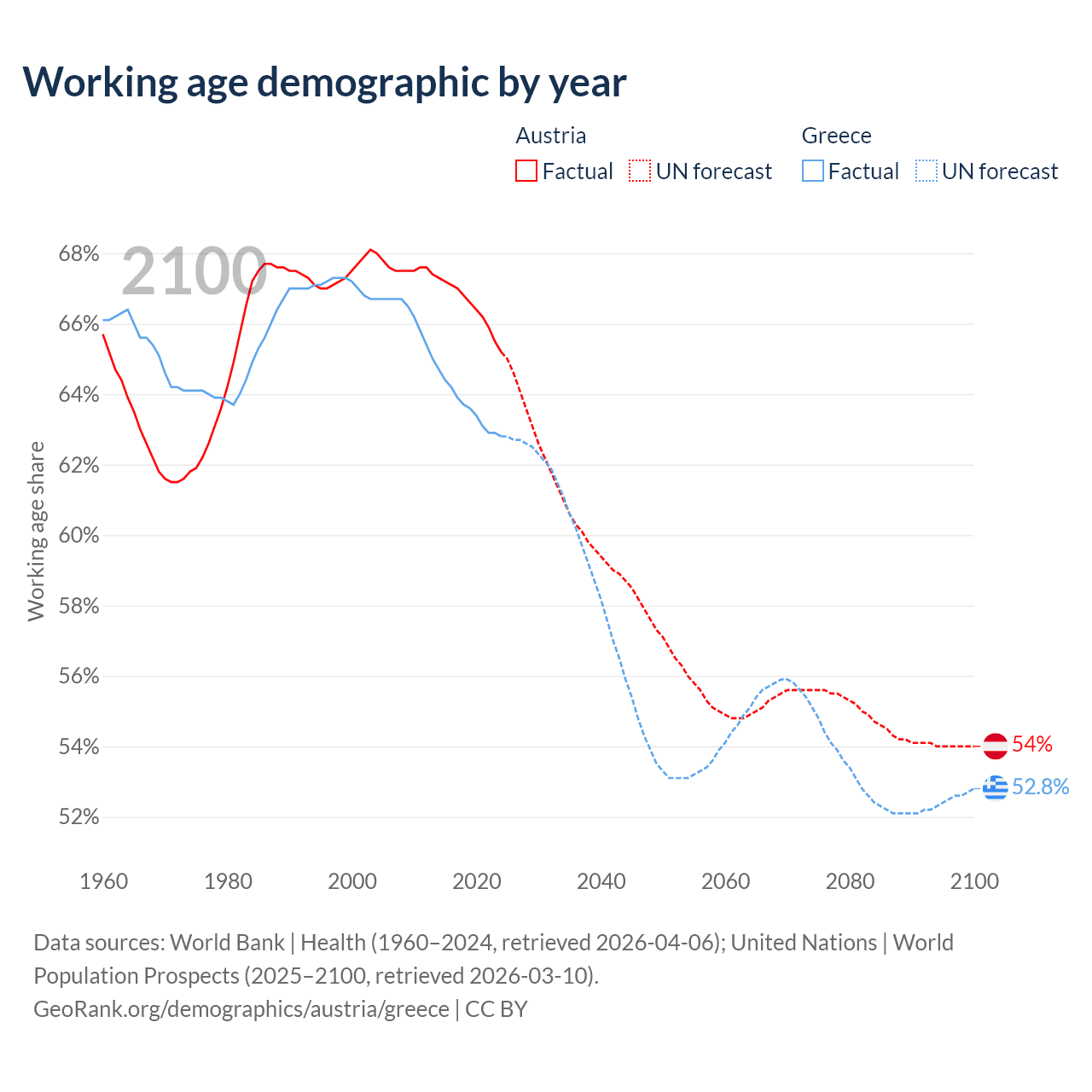 Median age Austria vs Greece, 1960-2100