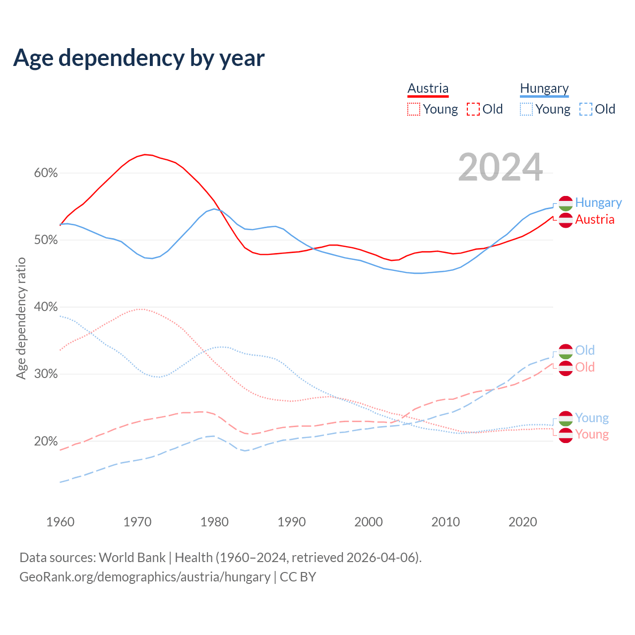 - Austria is ranked 19/196 by median age (oldest to youngest) vs 17/196 for Hungary.