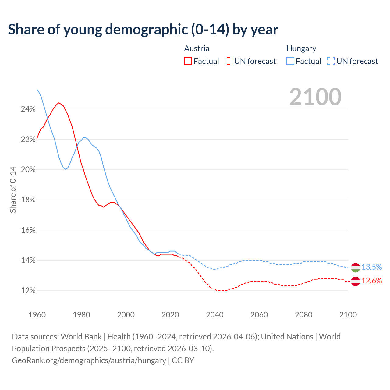 - The share of young demographic (0-15 years old) in Austria is 14.2% vs 14.4% in Hungary.