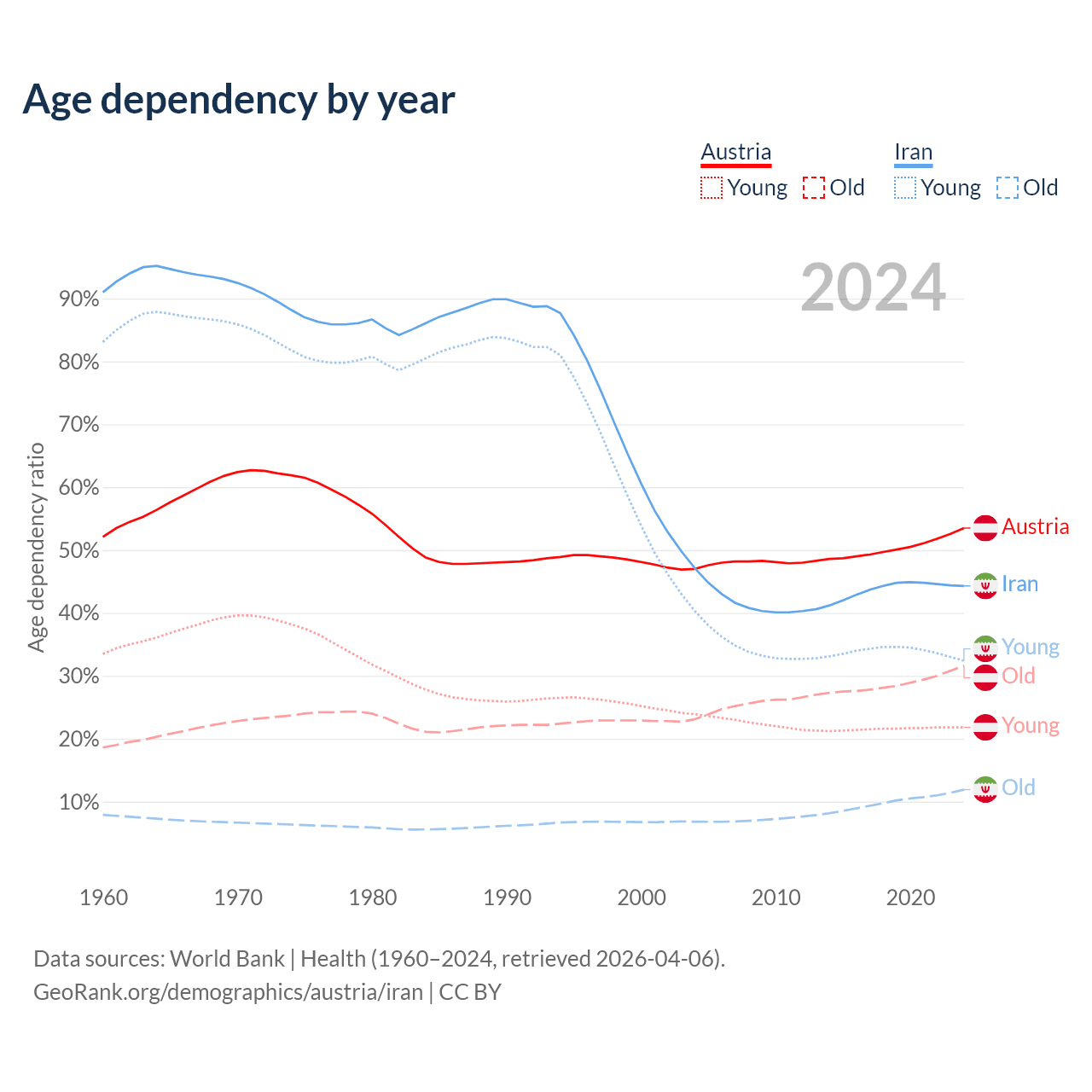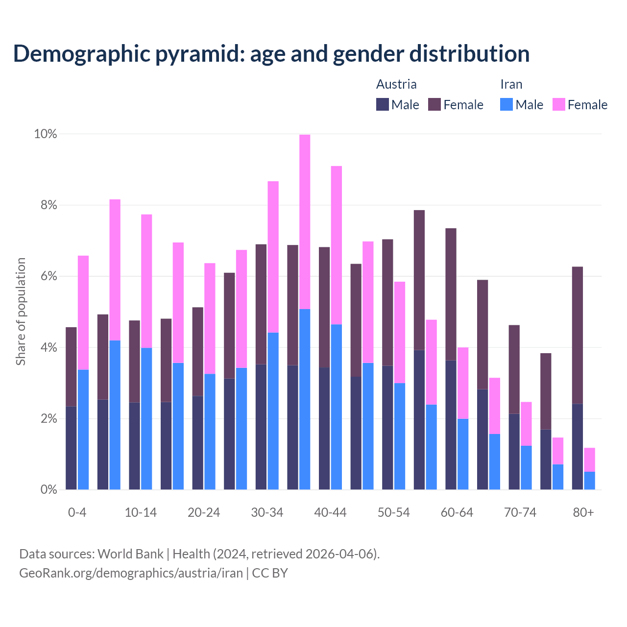 - The share of old-age demographic (65+) in Austria is 20.6% vs 8.24% in Iran.