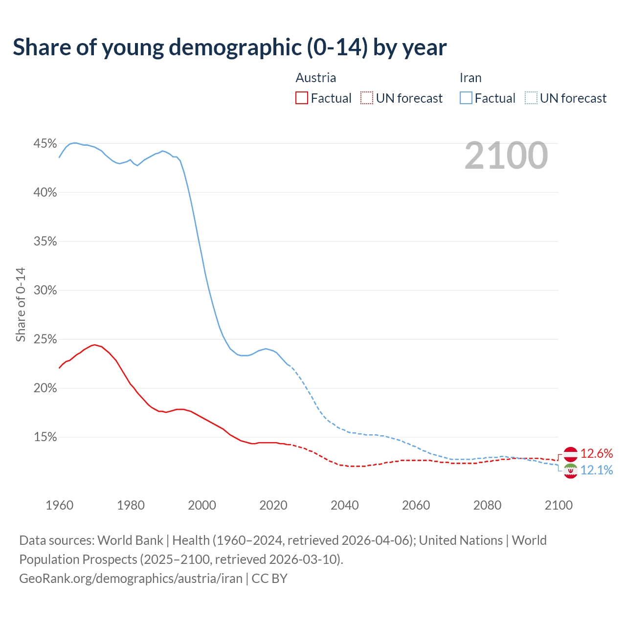 - The share of young demographic (0-15 years old) in Austria is 14.2% vs 22.4% in Iran.