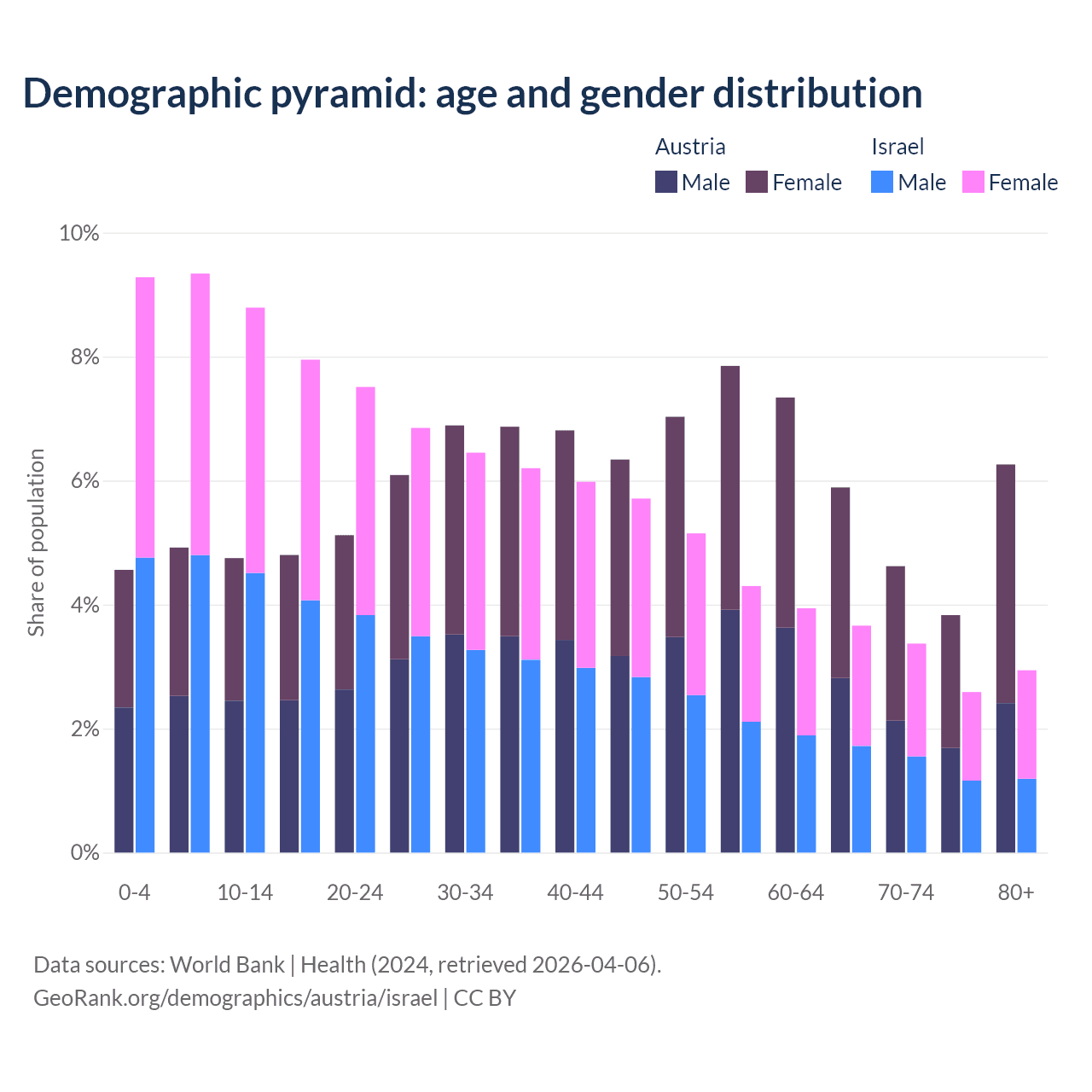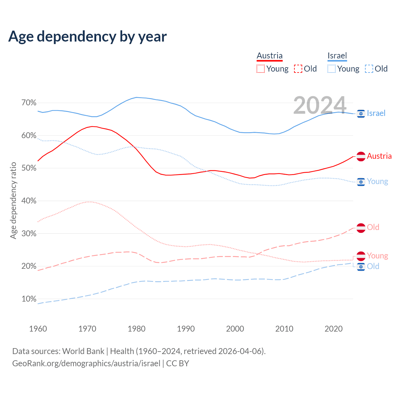 - Austria is ranked 19/196 by median age (oldest to youngest) vs 103/196 for Israel.
