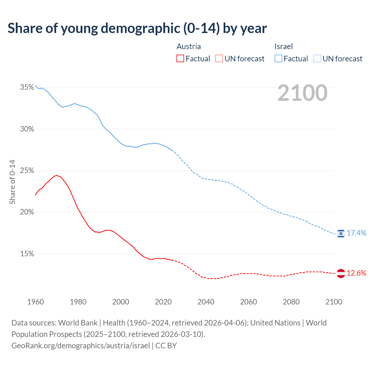 - The share of young demographic (0-15 years old) in Austria is 14.2% vs 27.4% in Israel.