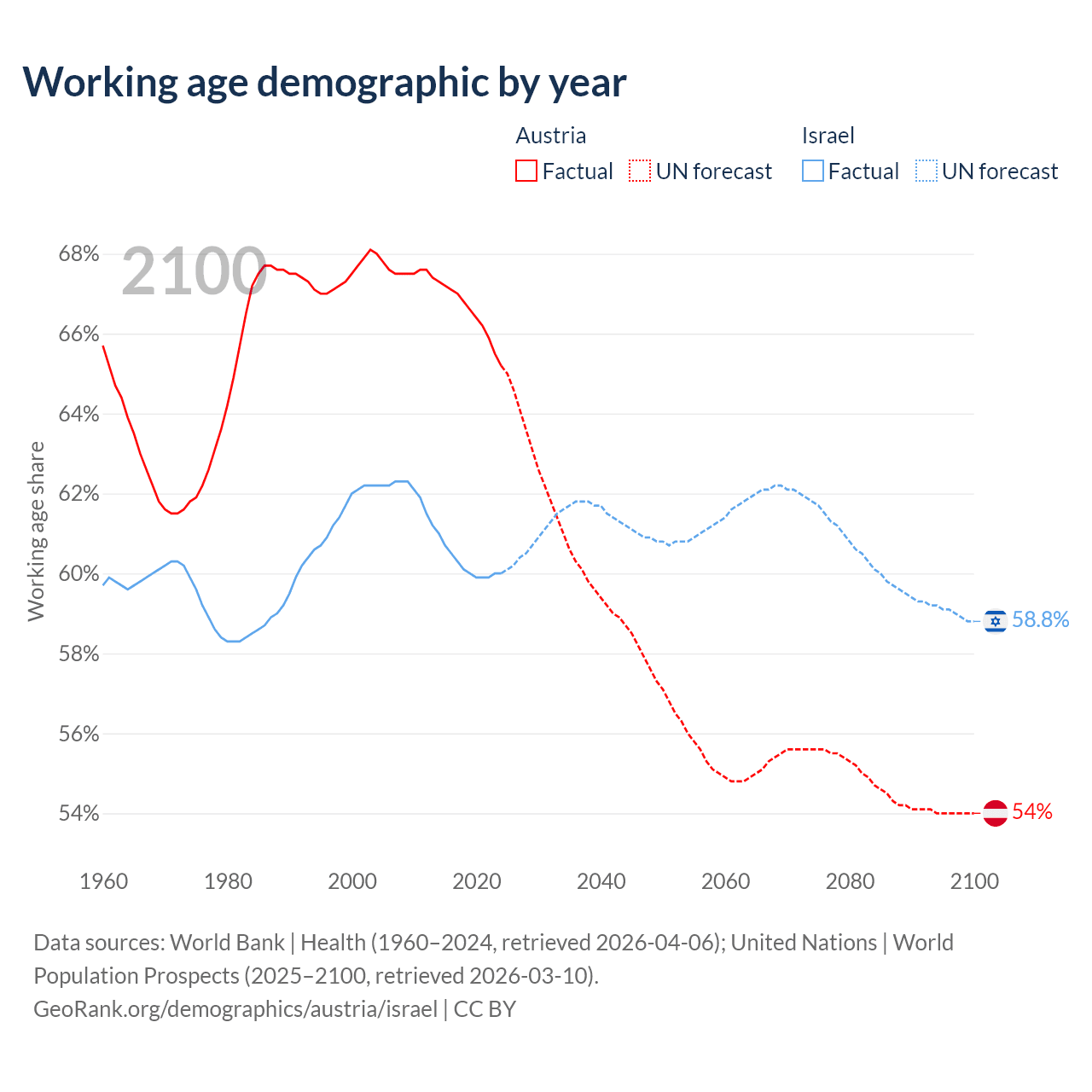 - Austria has 5.97M working age adults (aged 15-64) vs 6.18M in Israel.
