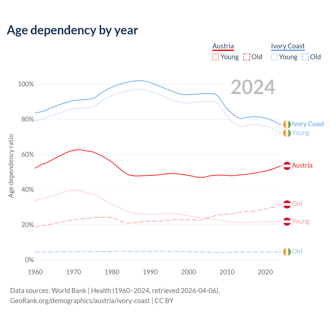 - Austria is ranked 19/196 by median age (oldest to youngest) vs 175/196 for Ivory Coast.