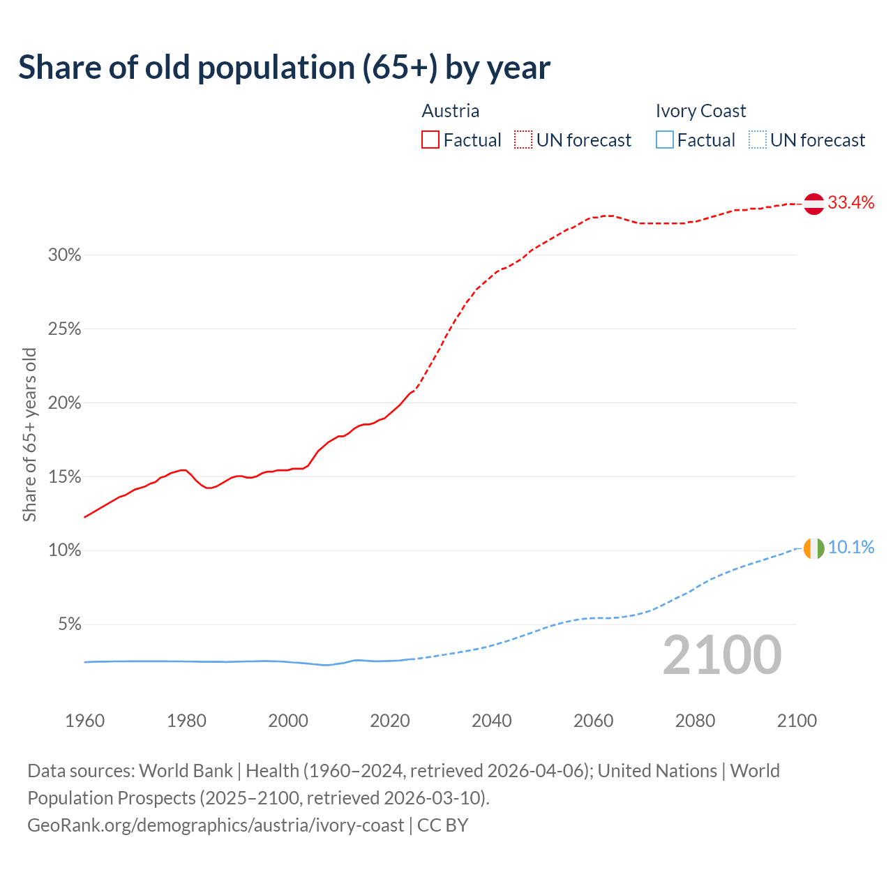 The share of older people aged 65 and over is 20.6% in Austria and 2.61% in Ivory Coast. Life expectancy in Austria compared to Ivory Coast .