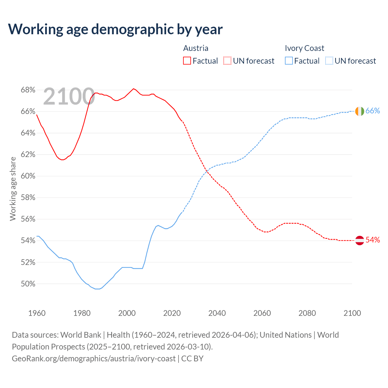 Median age Austria vs Ivory Coast, 1960-2100