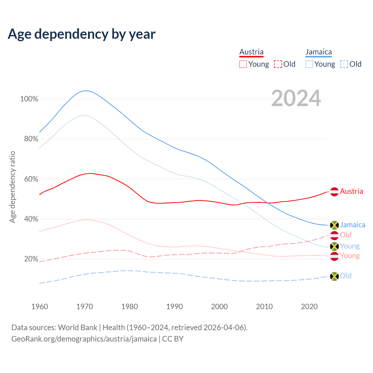 - Austria is ranked 19/196 by median age (oldest to youngest) vs 87/196 for Jamaica.