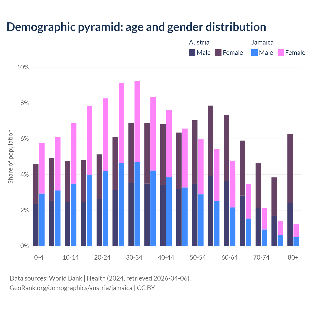 - The share of old-age demographic (65+) in Austria is 20.6% vs 8.21% in Jamaica.