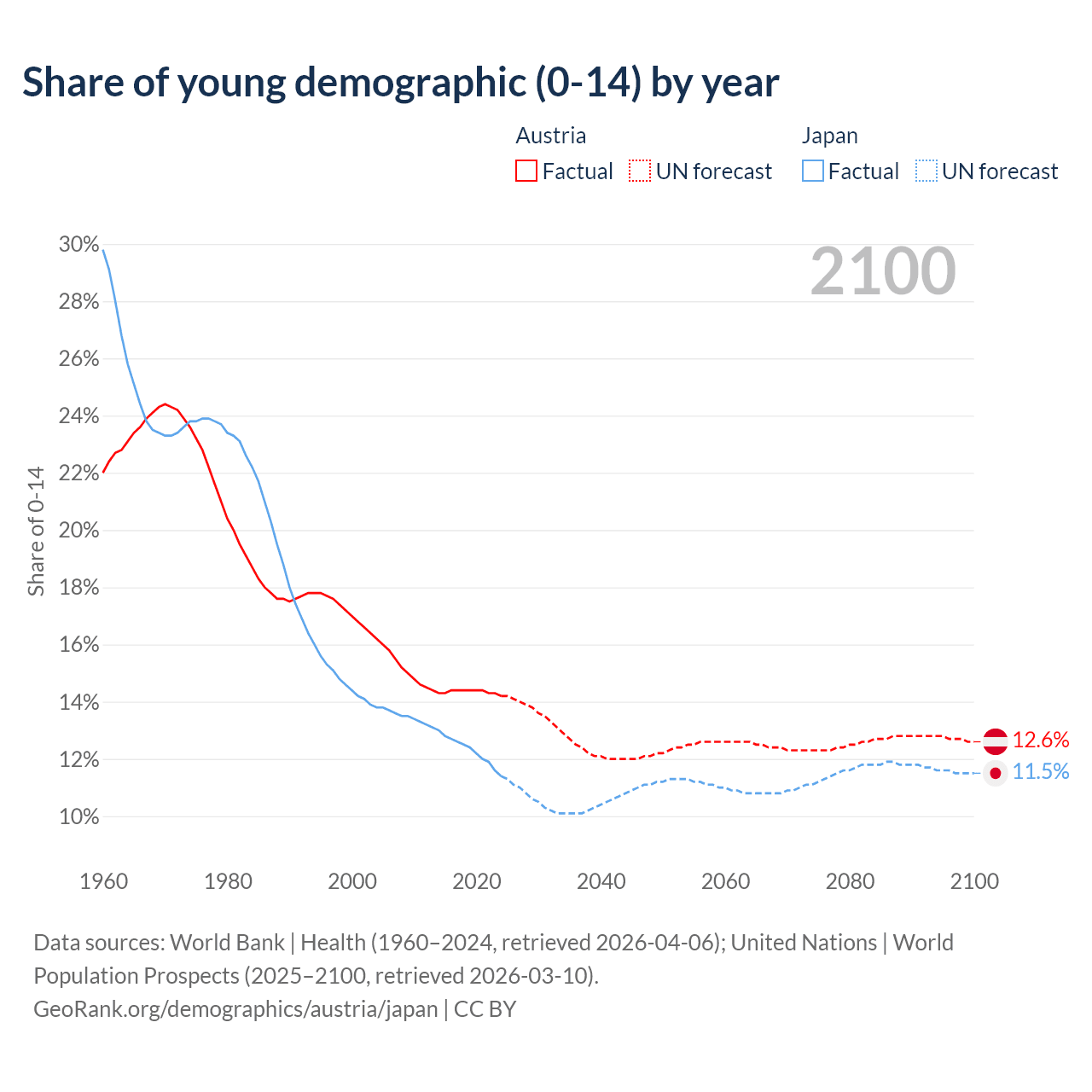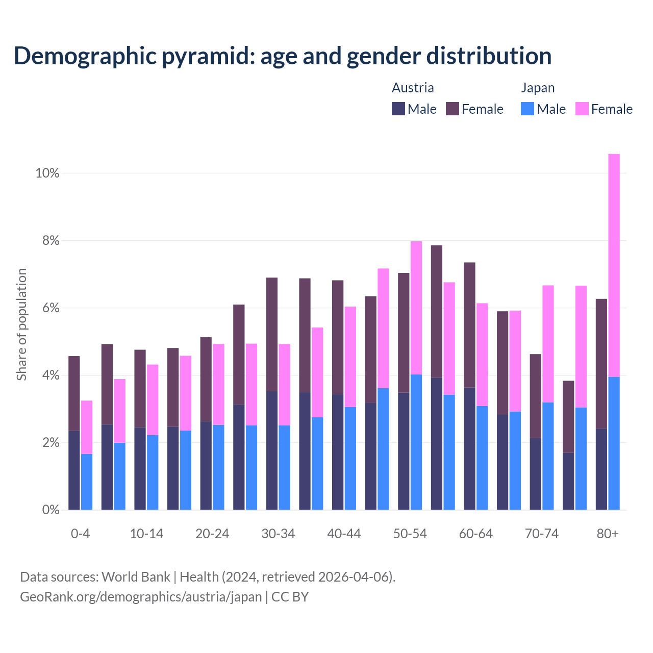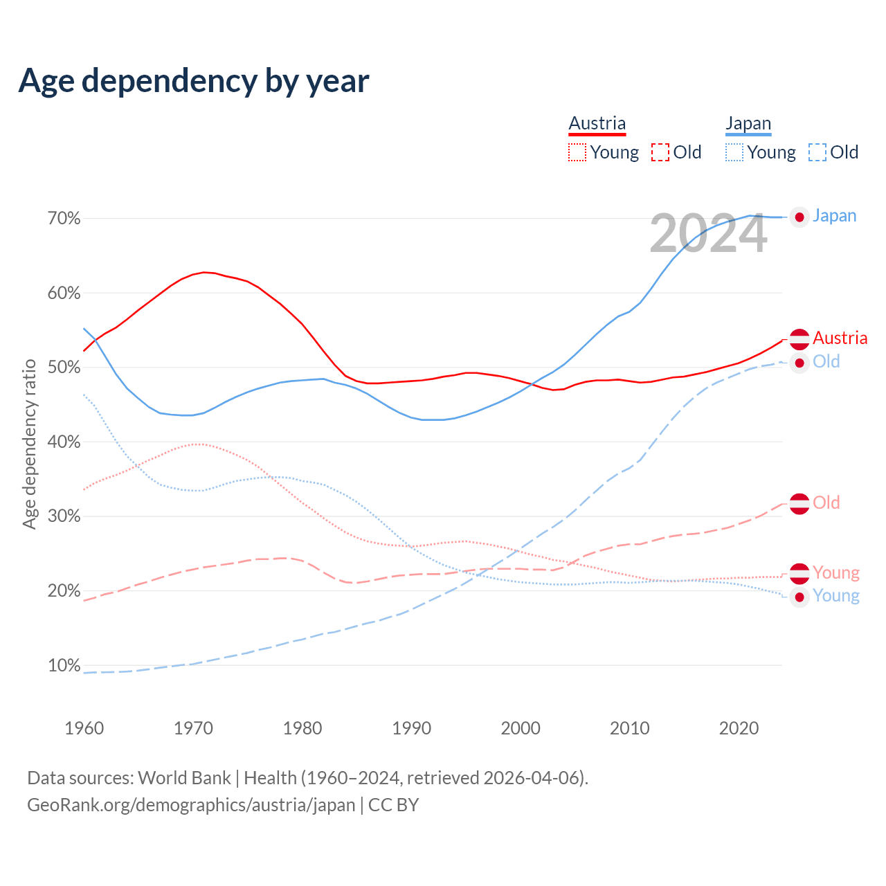 - Austria is ranked 19/196 by median age (oldest to youngest) vs 2/196 for Japan.