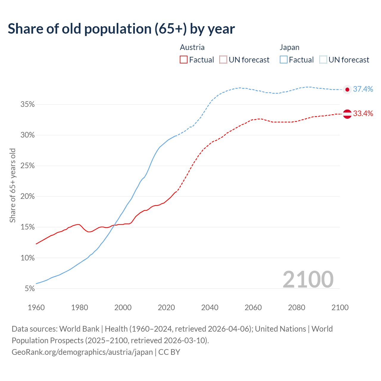 The share of older people aged 65 and over is 20.6% in Austria and 29.8% in Japan. Life expectancy in Austria compared to Japan .