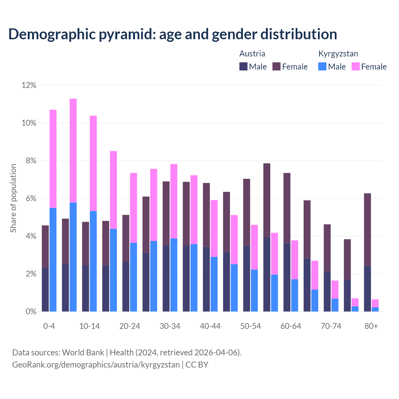 - The share of old-age demographic (65+) in Austria is 20.6% vs 5.68% in Kyrgyzstan.