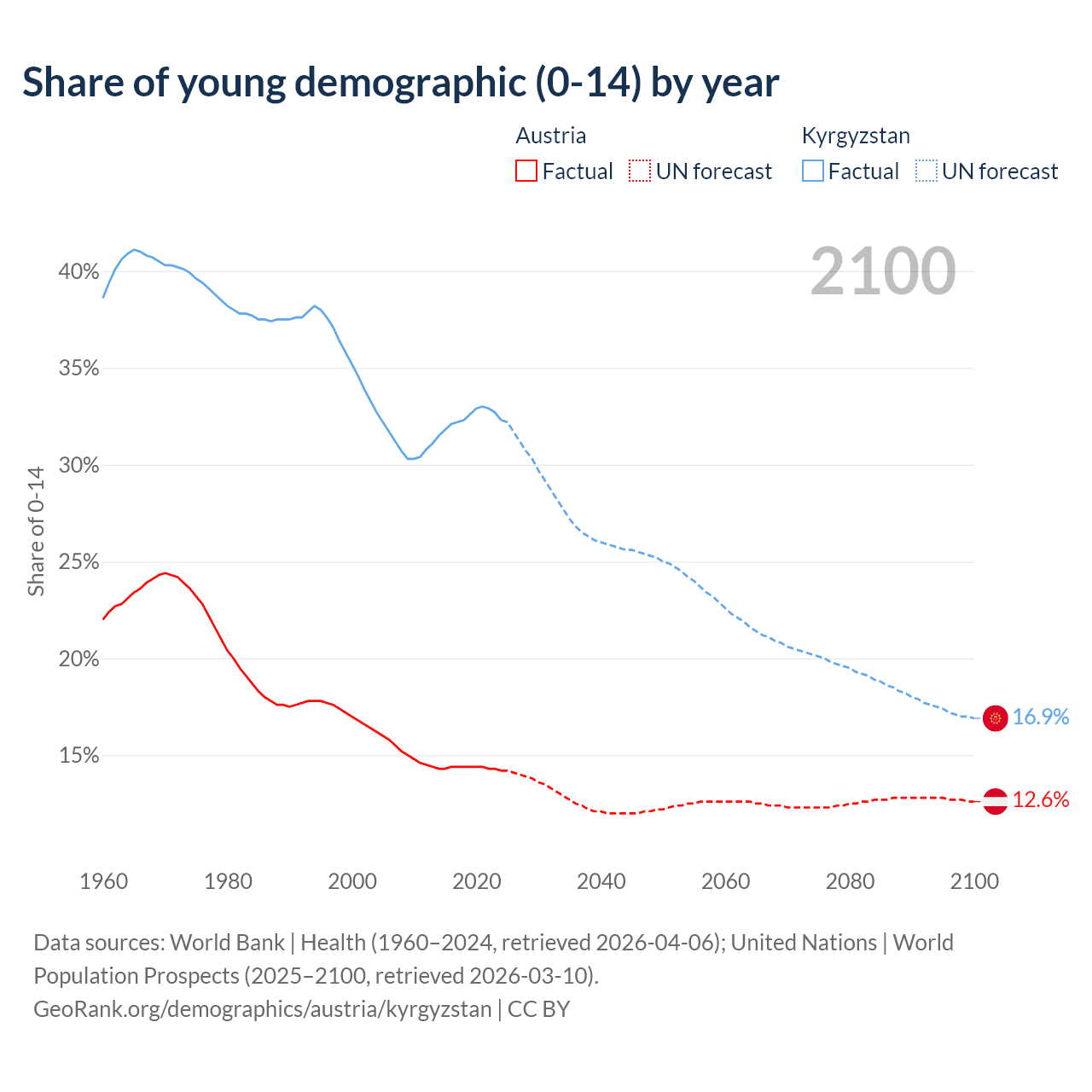 - The share of young demographic (0-15 years old) in Austria is 14.2% vs 32.3% in Kyrgyzstan.