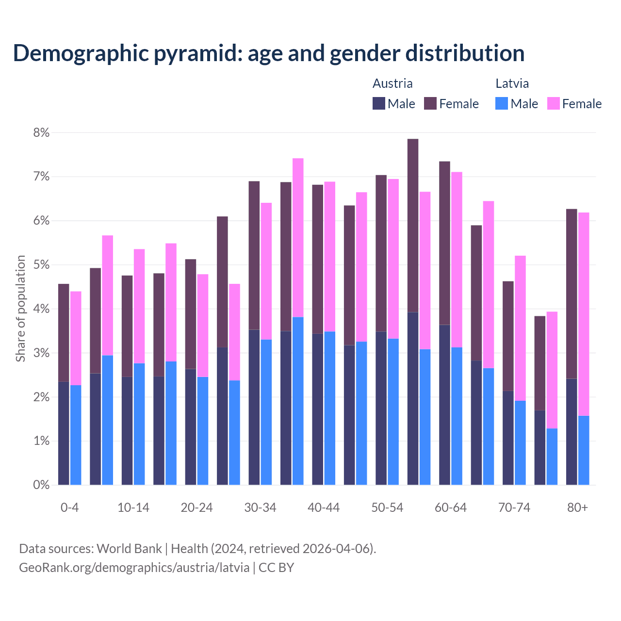 - Austria is ranked 19/196 by median age (oldest to youngest) vs 20/196 for Latvia.