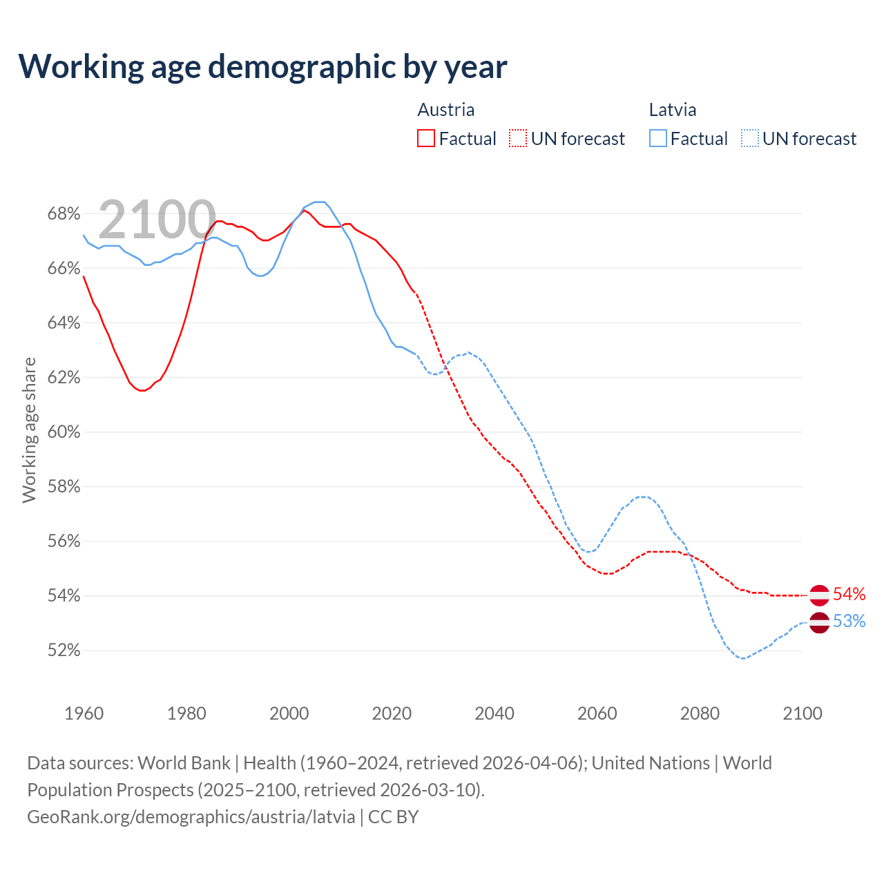 - Austria has 5.97M working age adults (aged 15-64) vs 1.15M in Latvia.