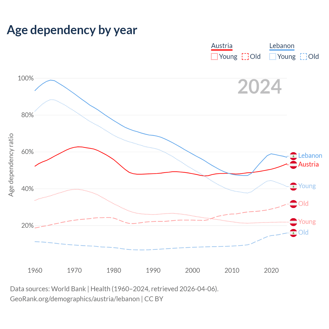 - Austria is ranked 19/196 by median age (oldest to youngest) vs 106/196 for Lebanon.