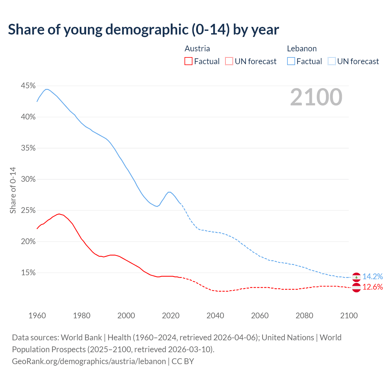 - The share of young demographic (0-15 years old) in Austria is 14.2% vs 26.2% in Lebanon.