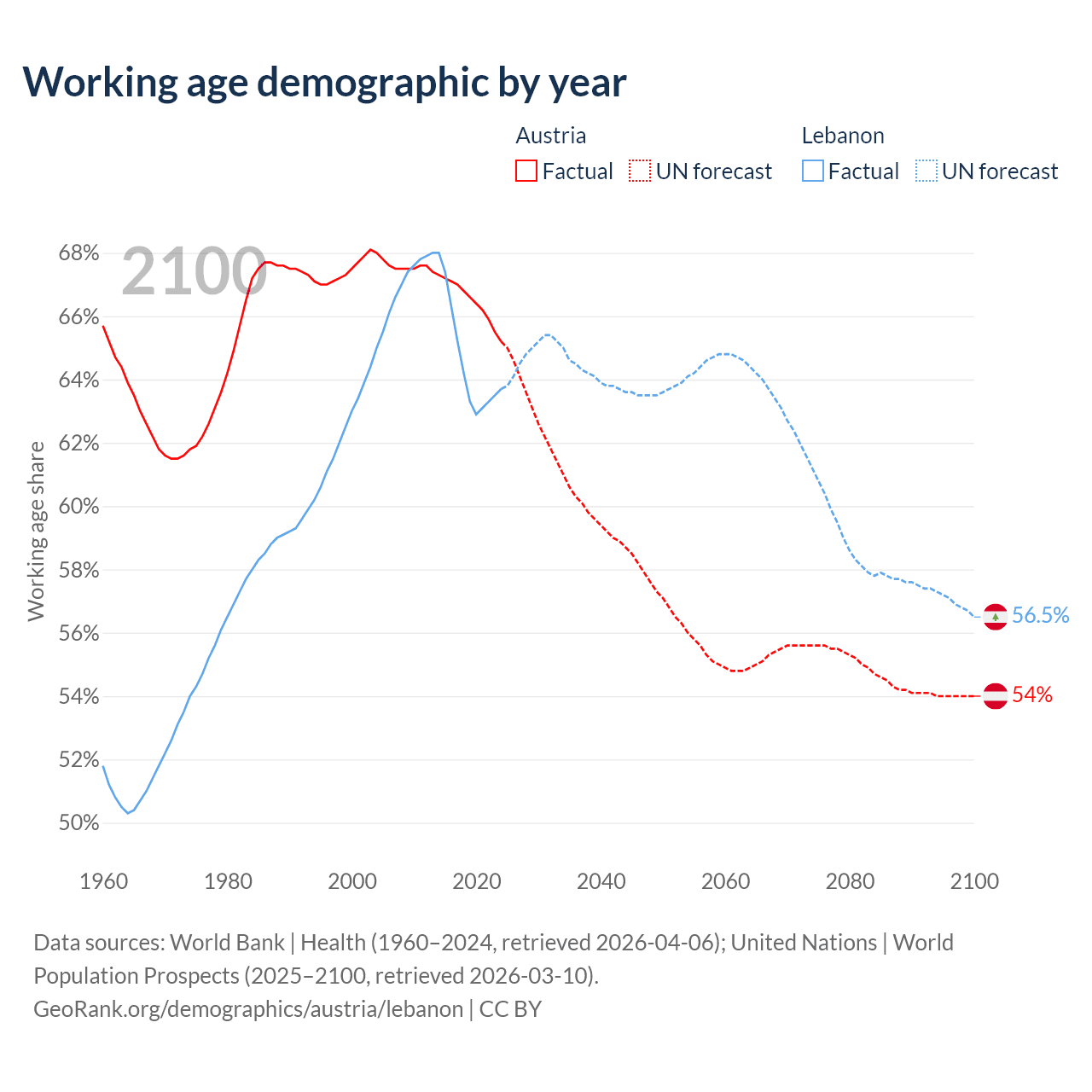 Median age Austria vs Lebanon, 1960-2100