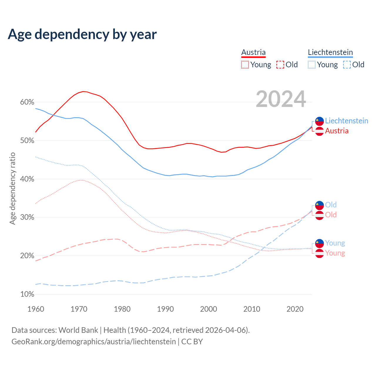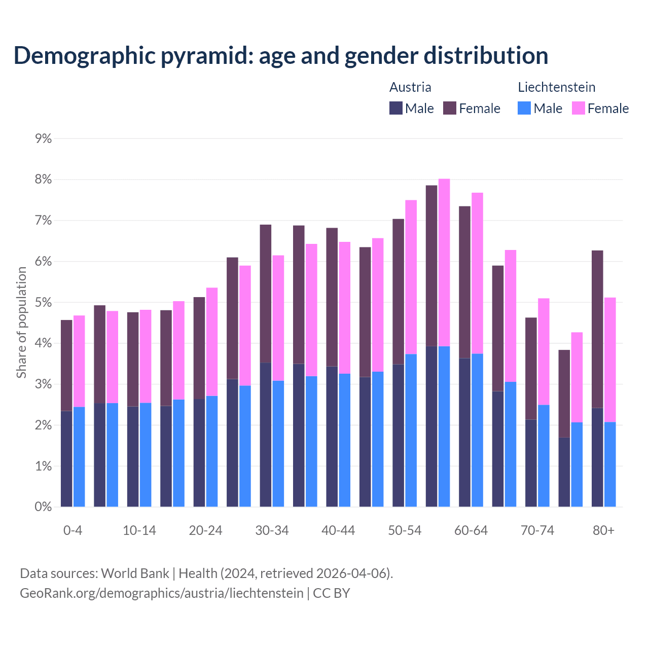 - The share of old-age demographic (65+) in Austria is 20.6% vs 20.7% in Liechtenstein.