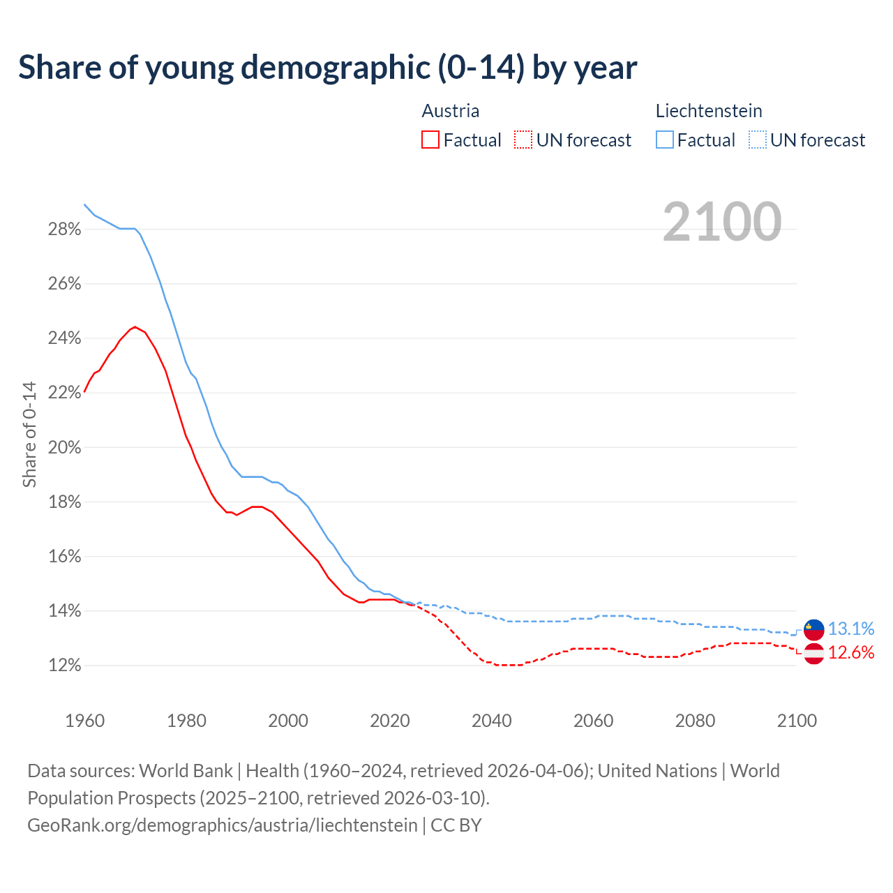 - The share of young demographic (0-15 years old) in Austria is 14.2% vs 14.3% in Liechtenstein.