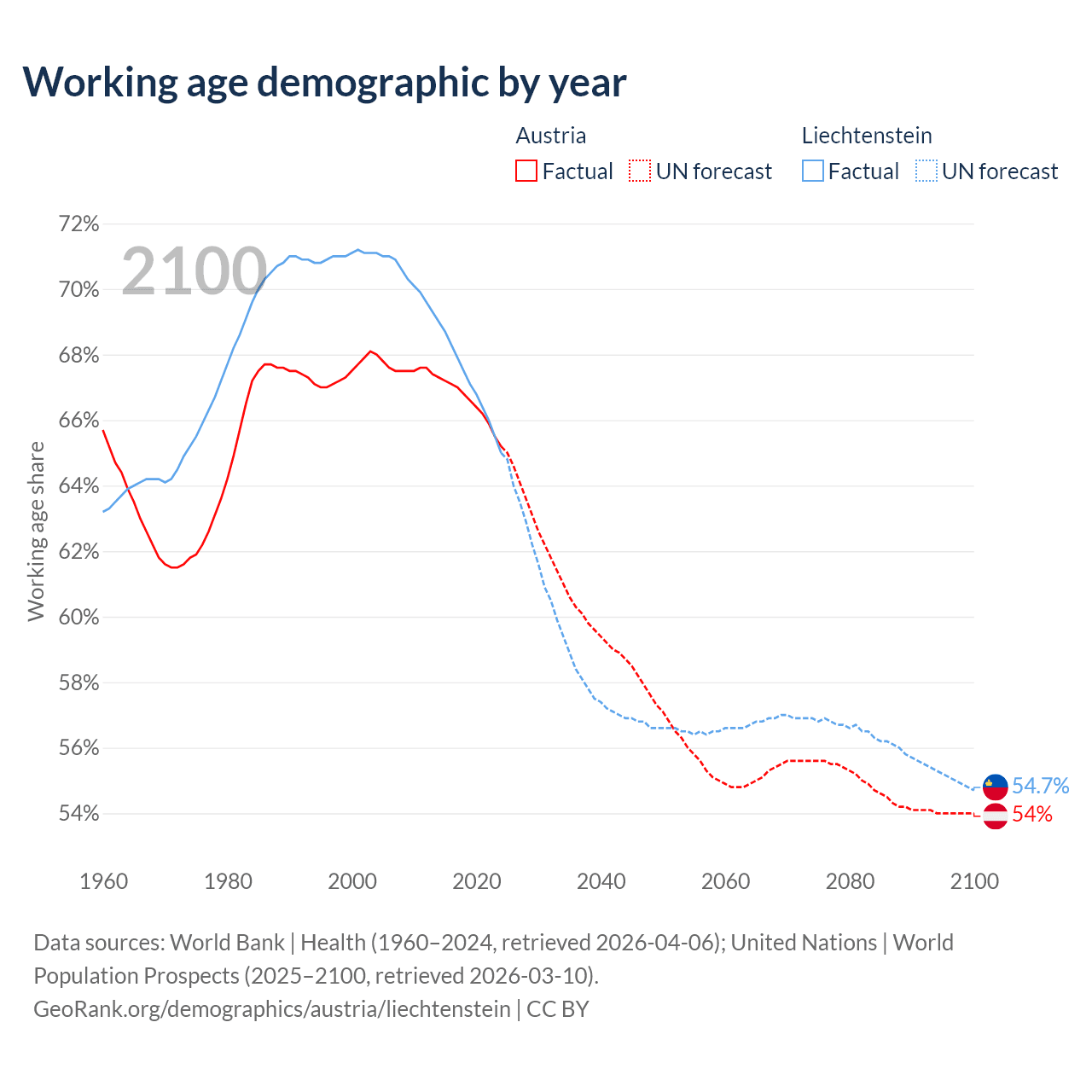- Austria has 5.97M working age adults (aged 15-64) vs 26.7K in Liechtenstein.