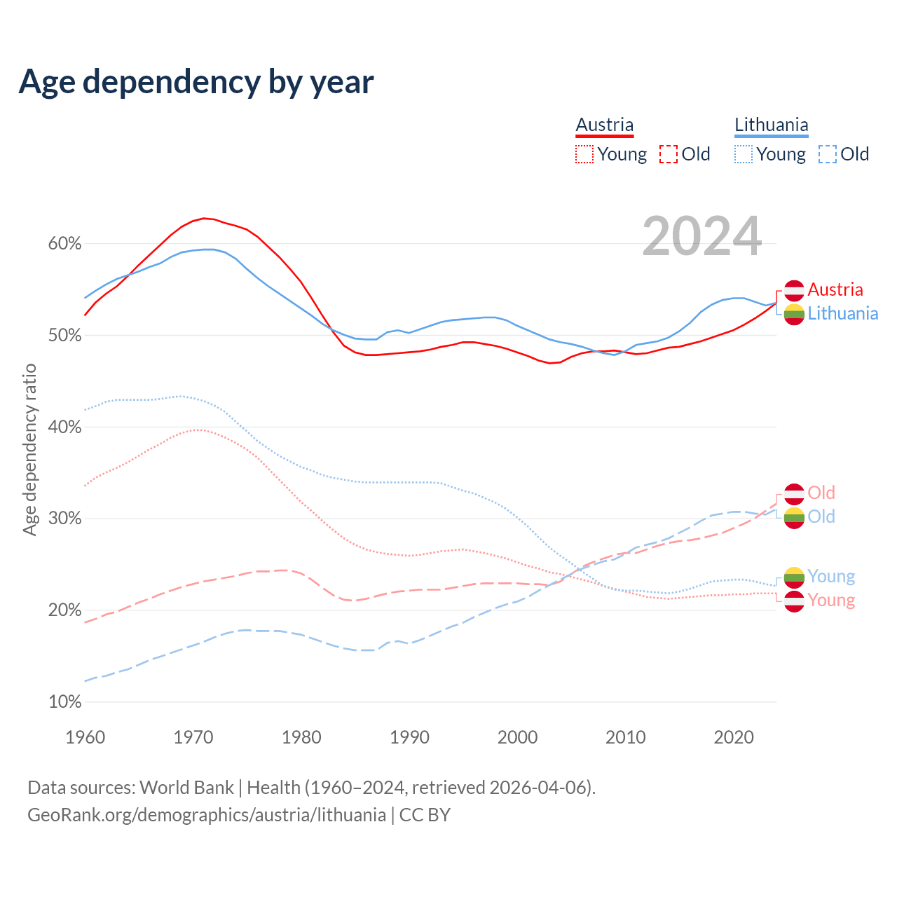 Data sources: World Bank | Health (1960–2024, retrieved 2026-04-06); U.S. Census Bureau (1960–2024, retrieved 2026-02-08).