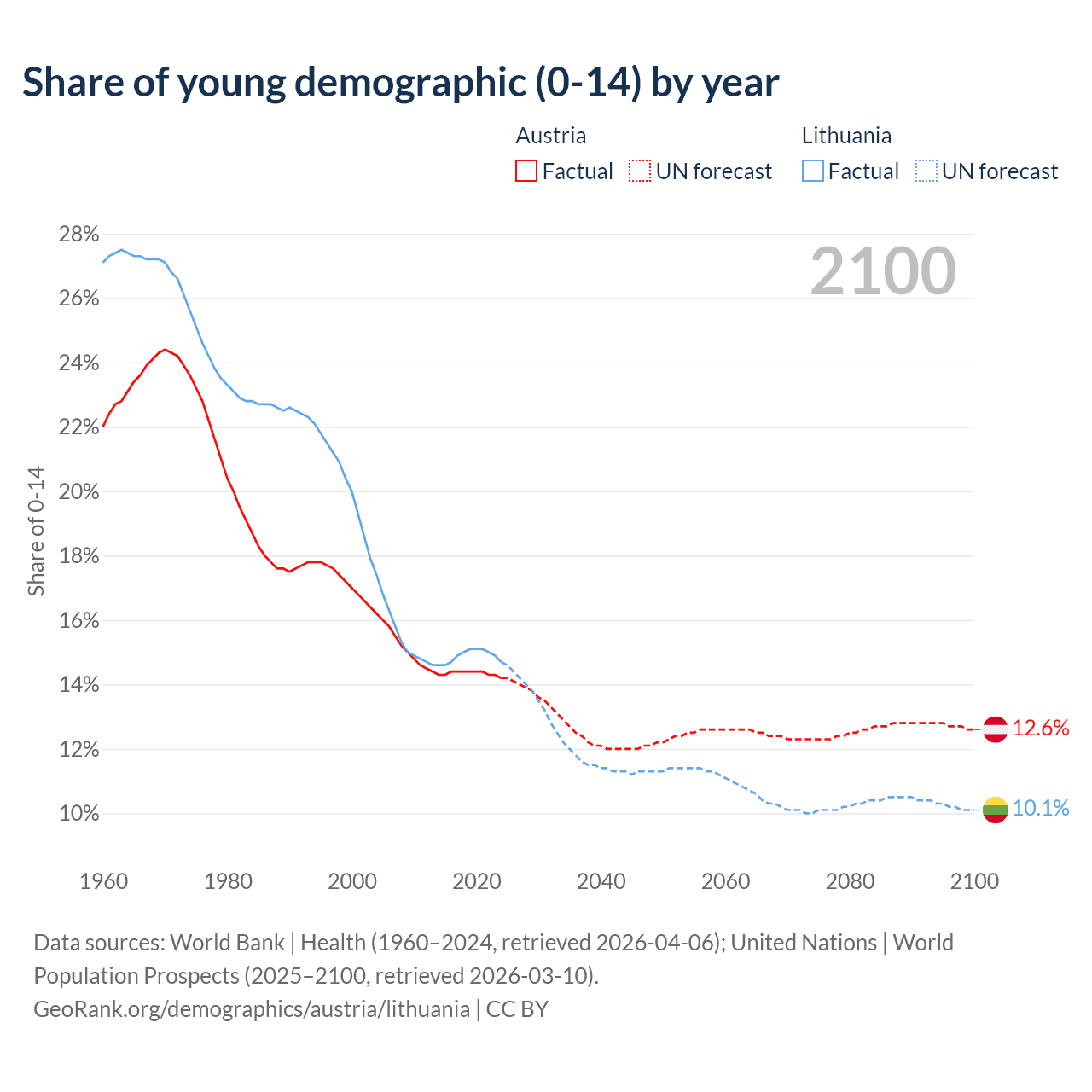 - The share of young demographic (0-15 years old) in Austria is 14.2% vs 14.7% in Lithuania.