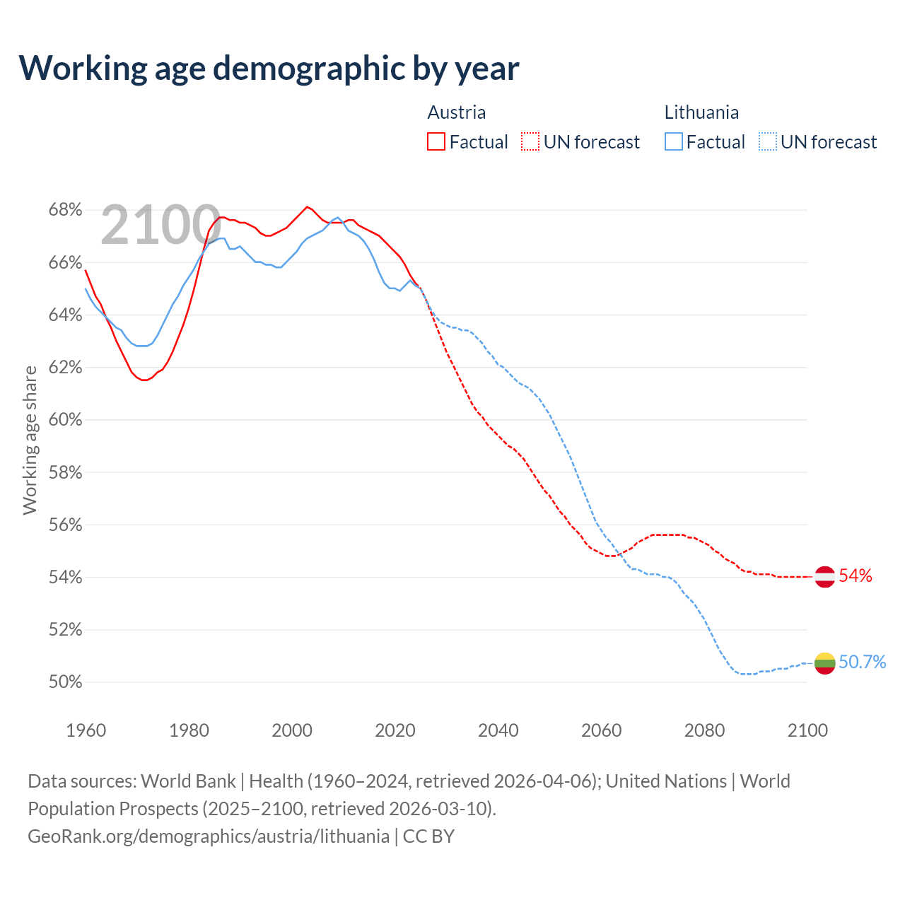 Median age Austria vs Lithuania, 1960-2100