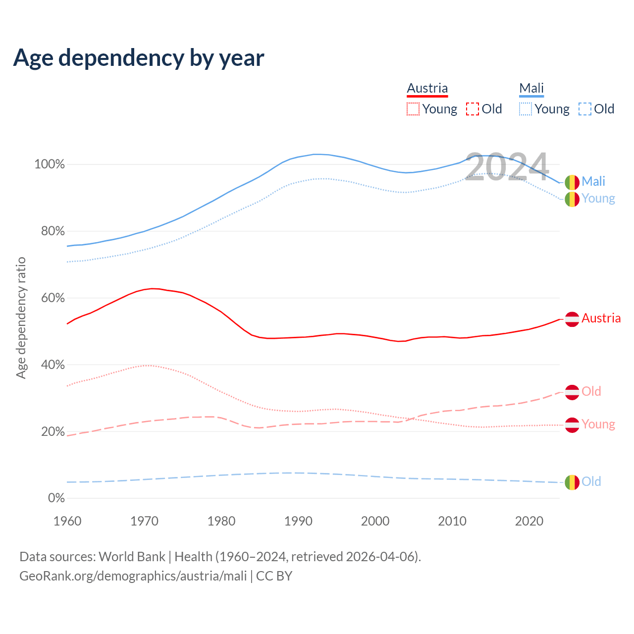 - The share of old-age demographic (65+) in Austria is 20.6% vs 2.38% in Mali.