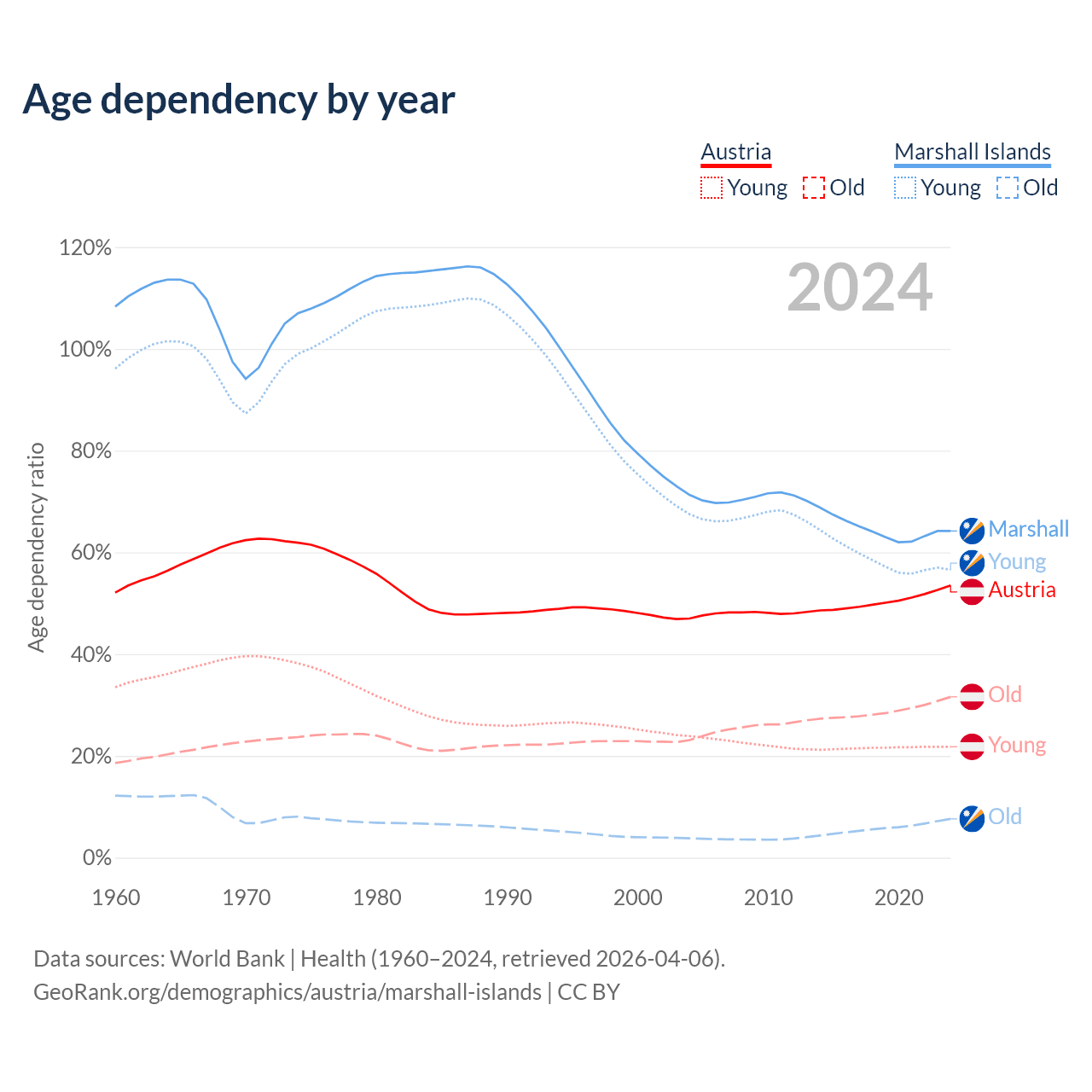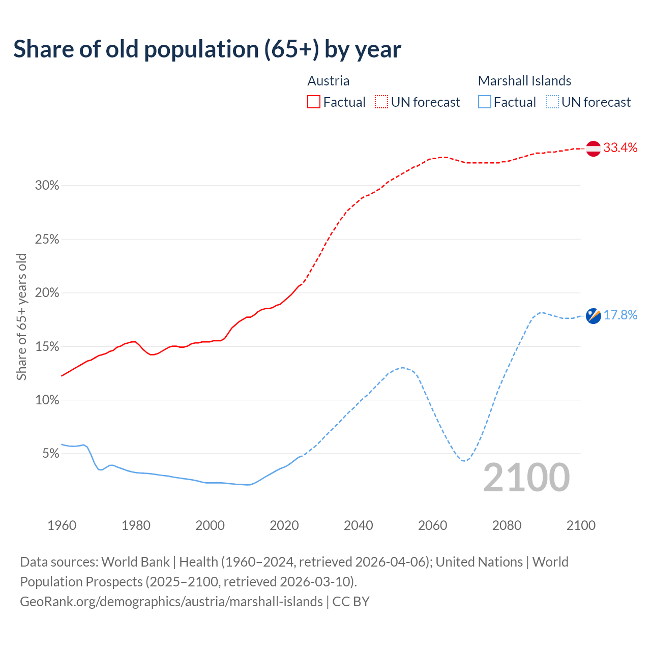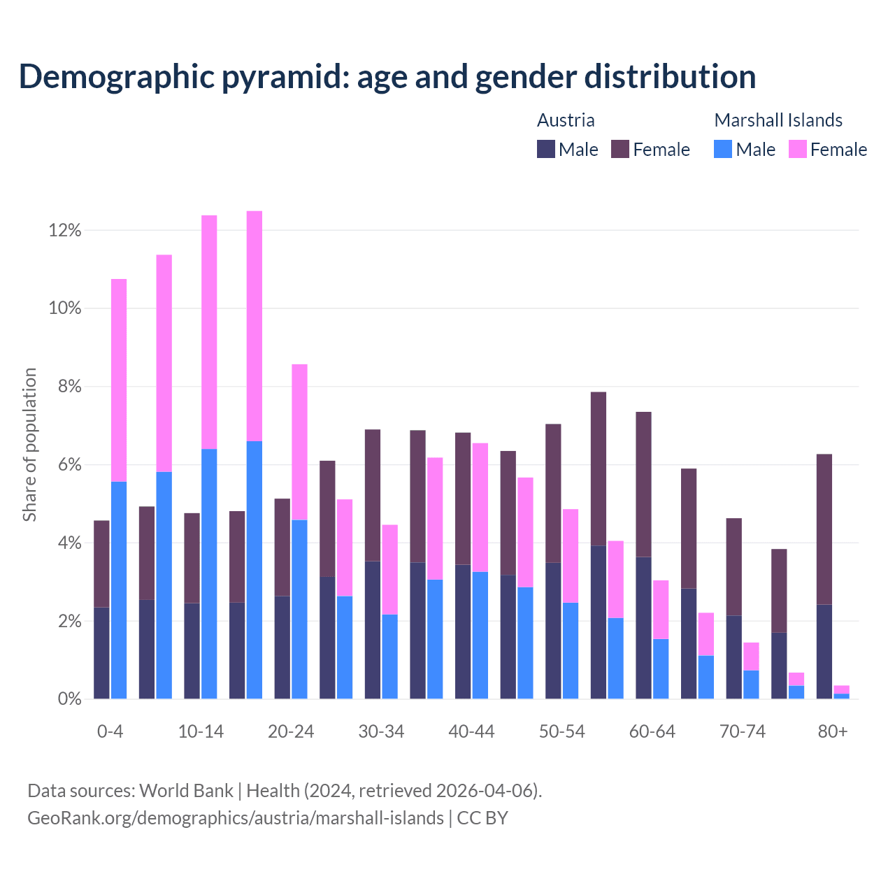 - The share of old-age demographic (65+) in Austria is 20.6% vs 4.64% in the Marshall Islands.